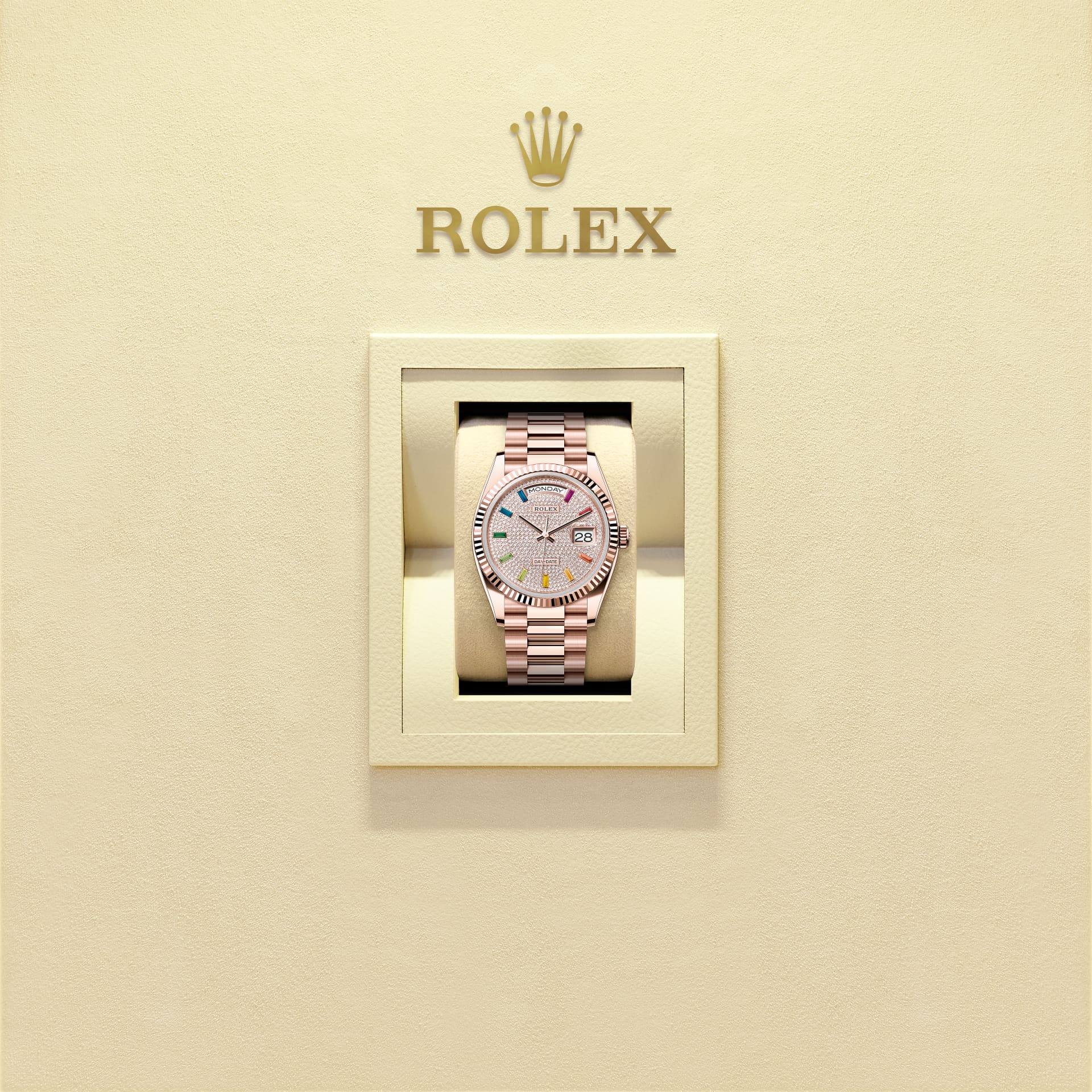 蚝式恒动星期日历型 36腕表18K永恒玫瑰金款,搭配密镶钻石表盘、三角坑纹外圈及元首型(President)表带。