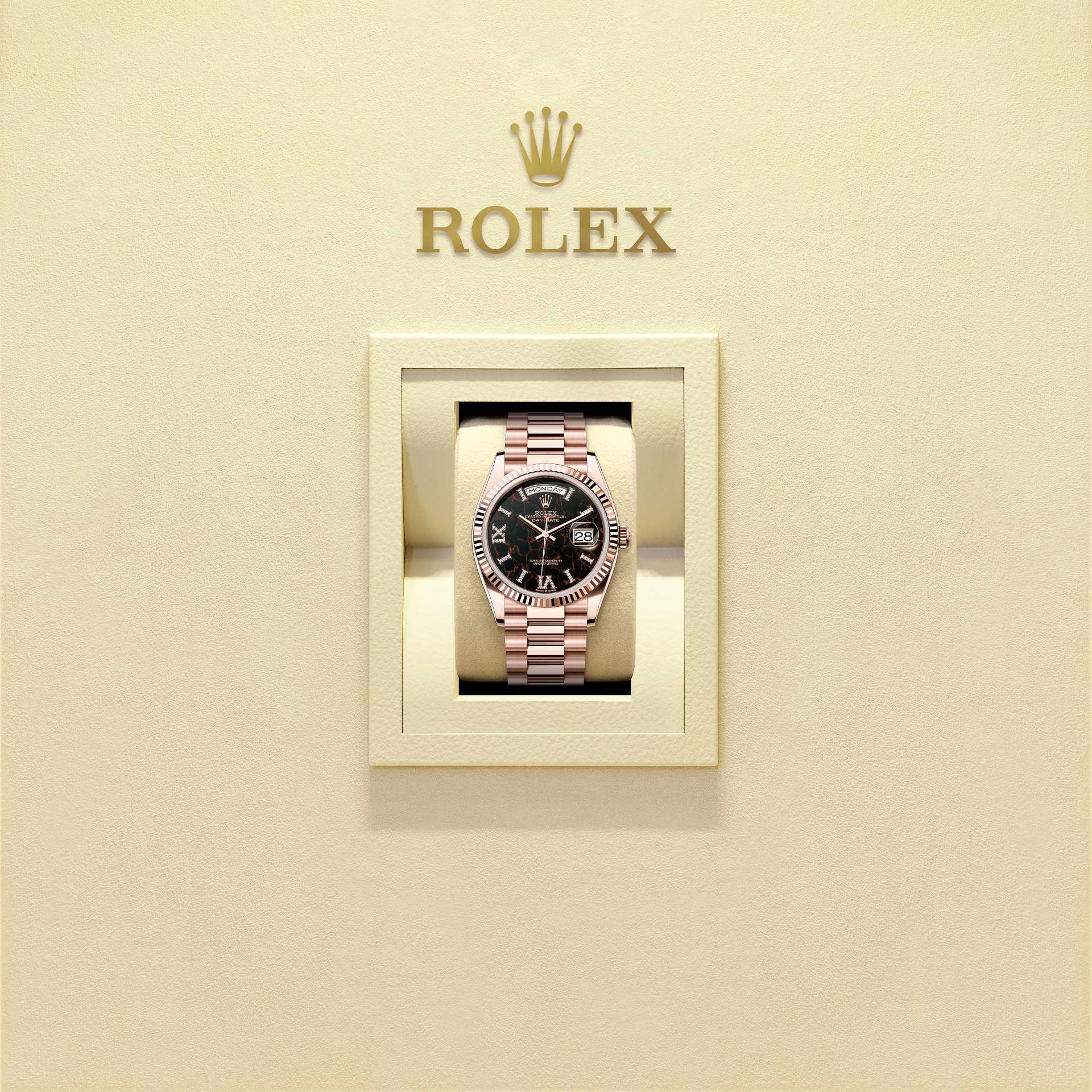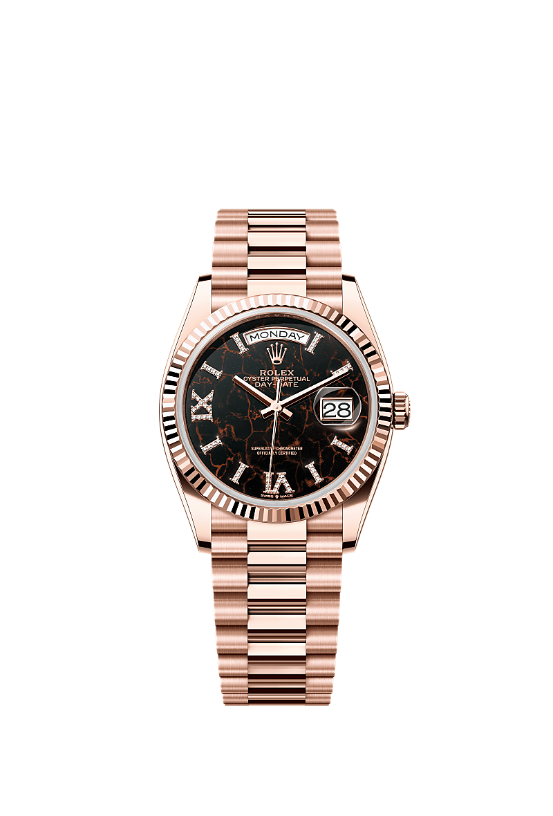 蚝式恒动星期日历型 36腕表18K永恒玫瑰金款,搭配镶钻赤铁石英表盘、三角坑纹外圈及元首型(President)表带。
