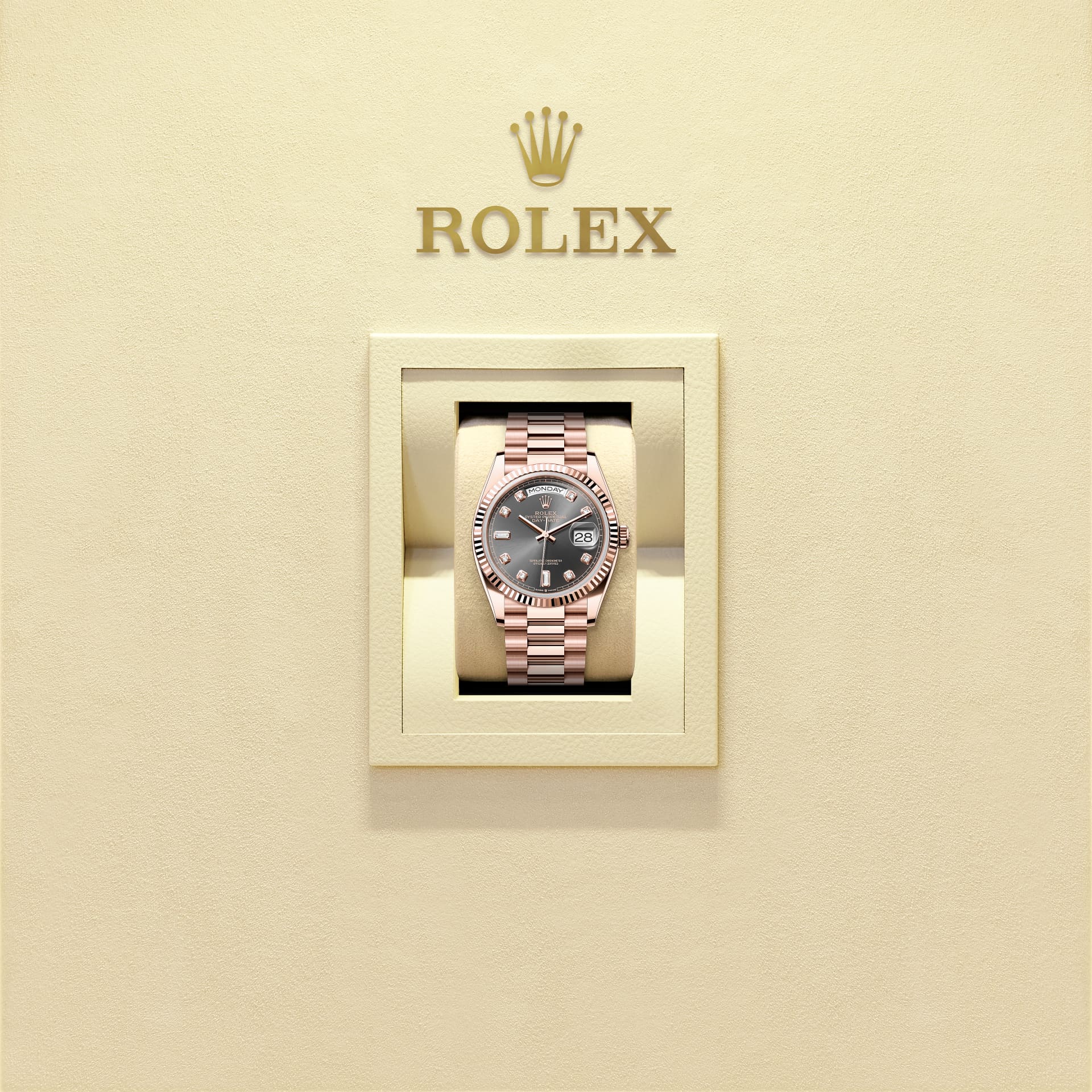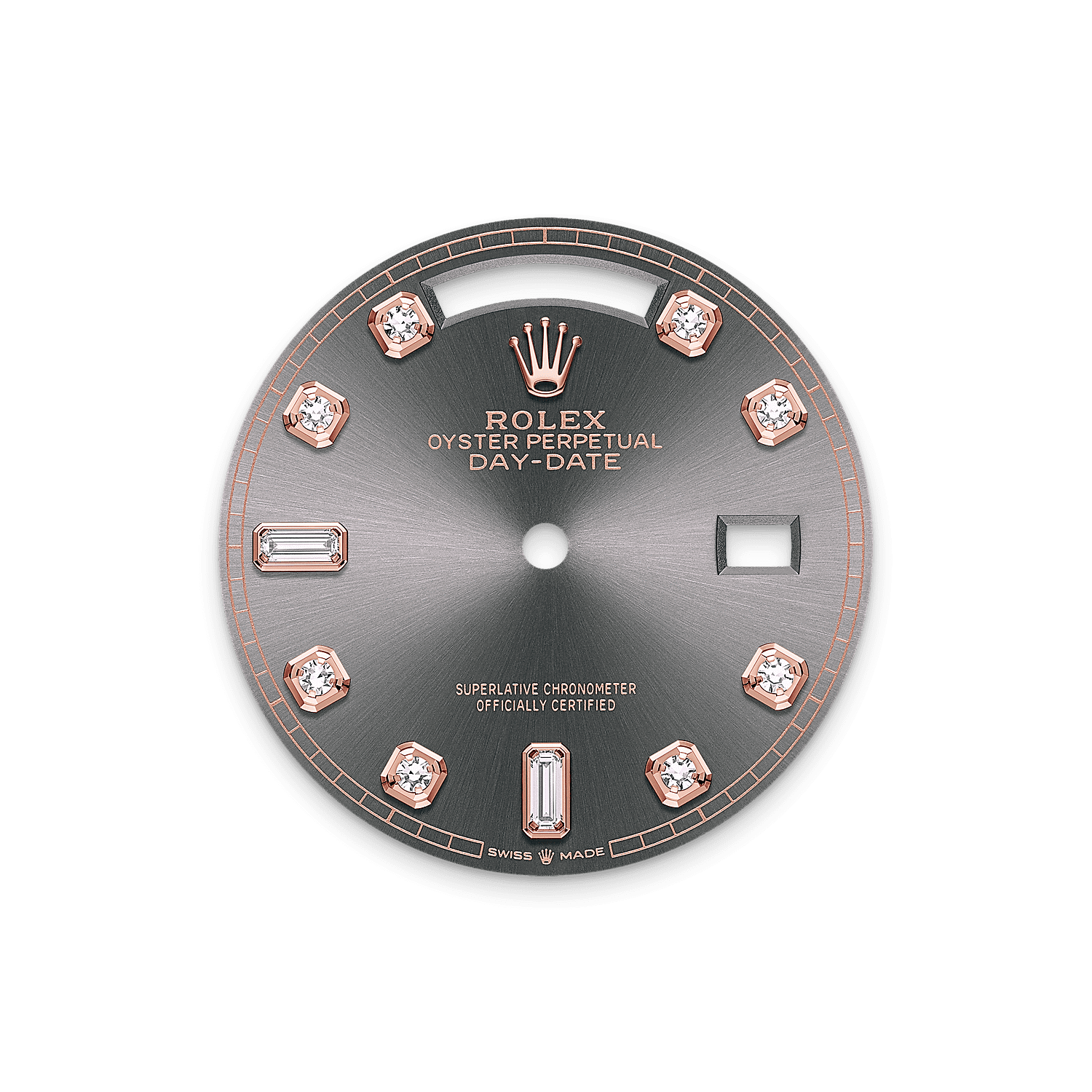 蚝式恒动星期日历型 36腕表18K永恒玫瑰金款,搭配镶钻石板灰色表盘、三角坑纹外圈及元首型(President)表带。