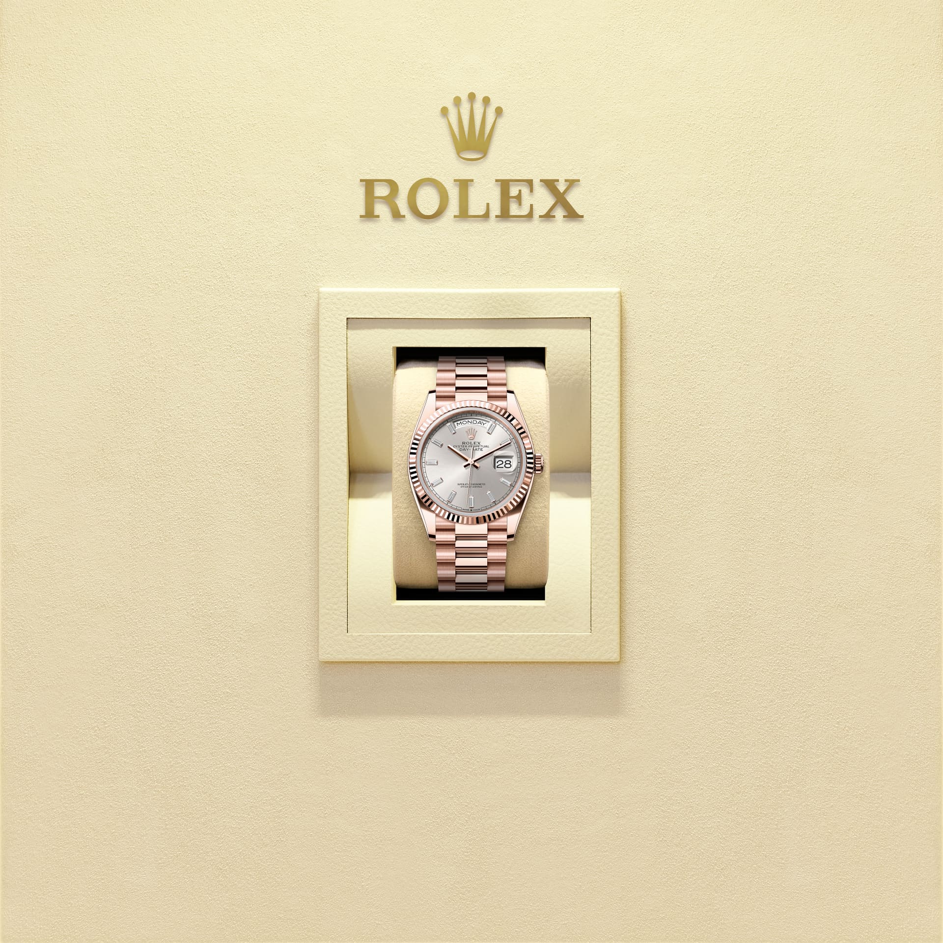 蚝式恒动星期日历型 36腕表18K永恒玫瑰金款,搭配镶钻银色表盘、三角坑纹外圈及元首型(President)表带。