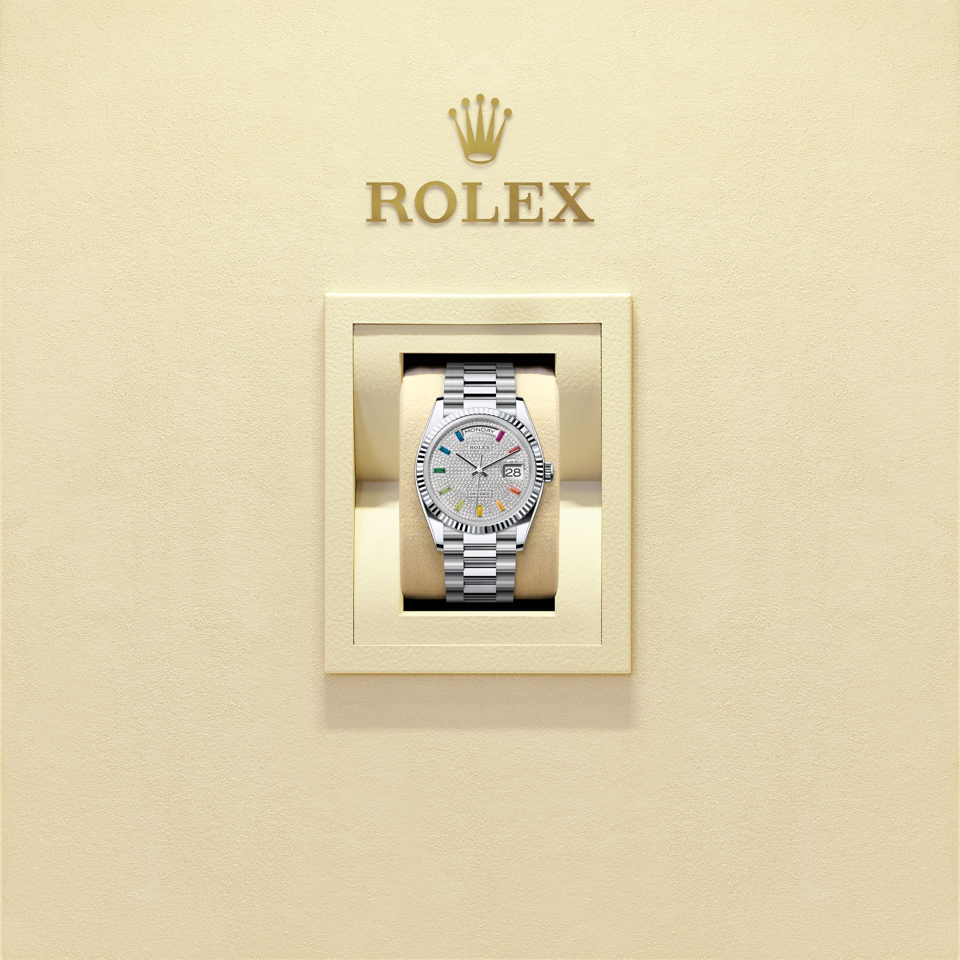 蚝式恒动星期日历型 36腕表铂金款,搭配密镶钻石表盘、三角坑纹外圈及元首型(President)表带。