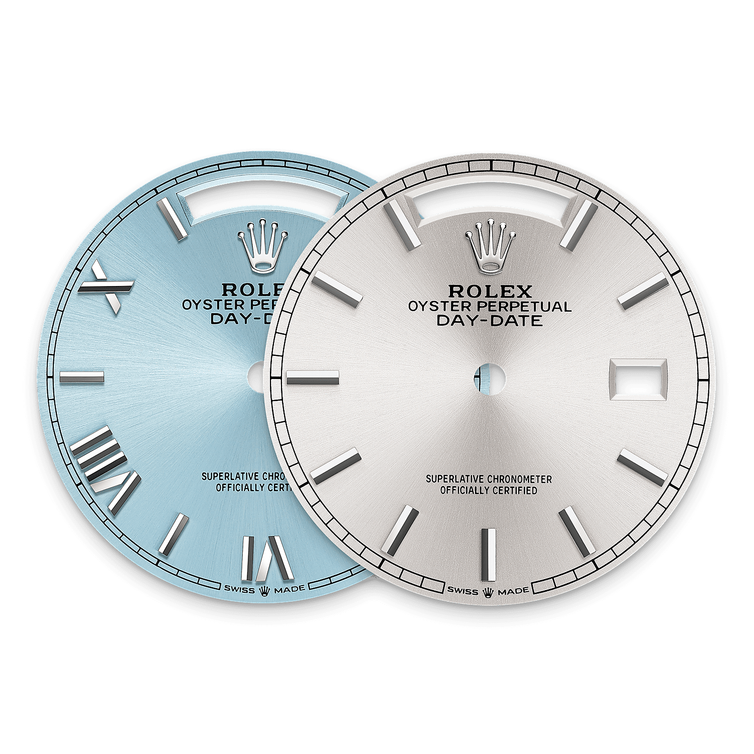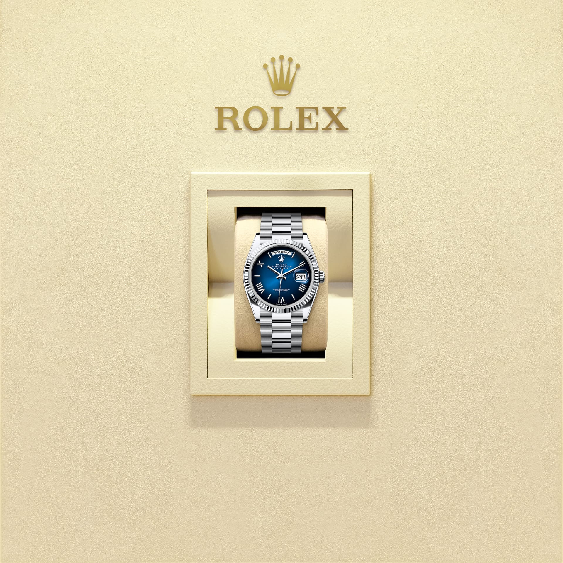 蚝式恒动星期日历型 36腕表铂金款,搭配渐变蓝色表盘、三角坑纹外圈及元首型(President)表带。