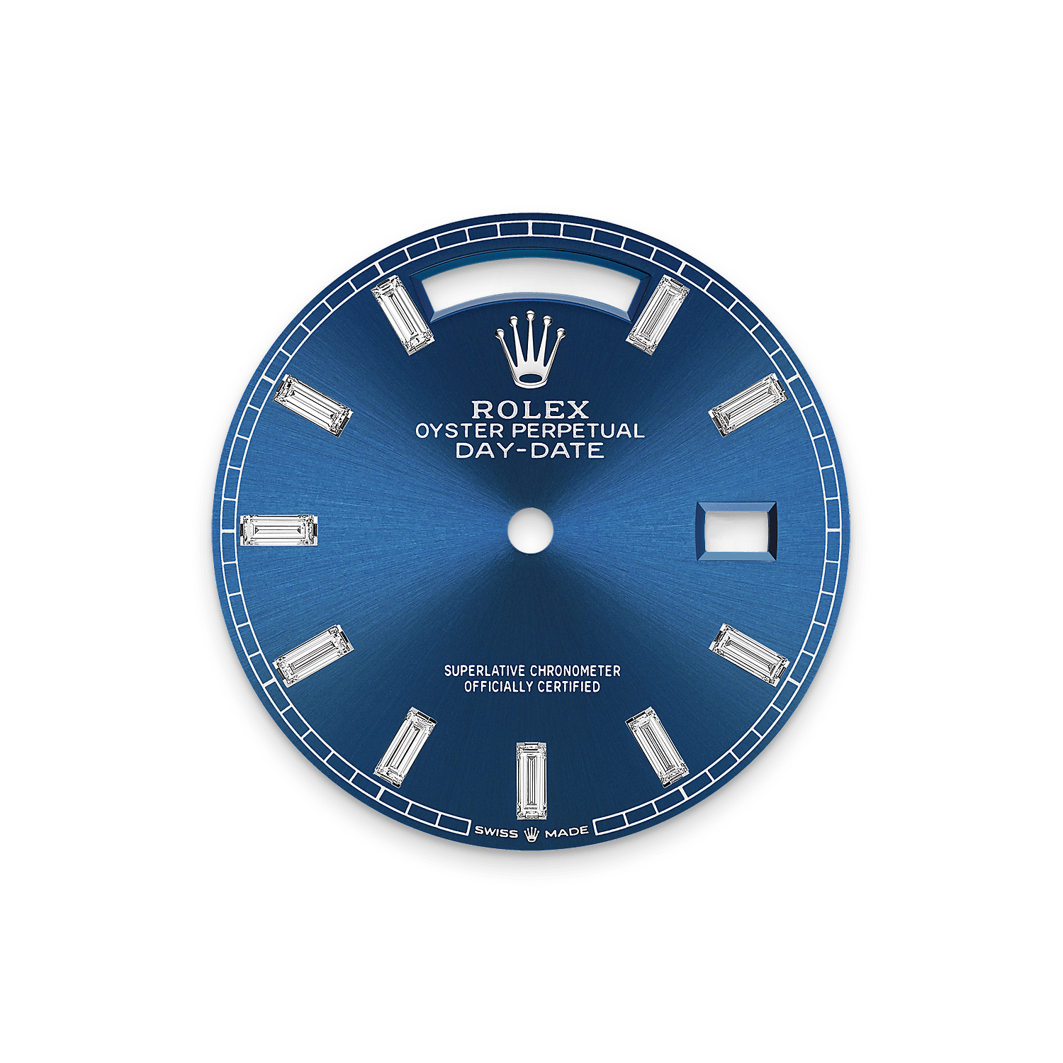 表盘设有10颗方形切割钻石。蚝式系列的许多表盘款式均采用太阳光线效果,折射出淡雅光泽。这种效果需要超卓的刷光技术,打造从表盘中央往外扩展的刻纹。