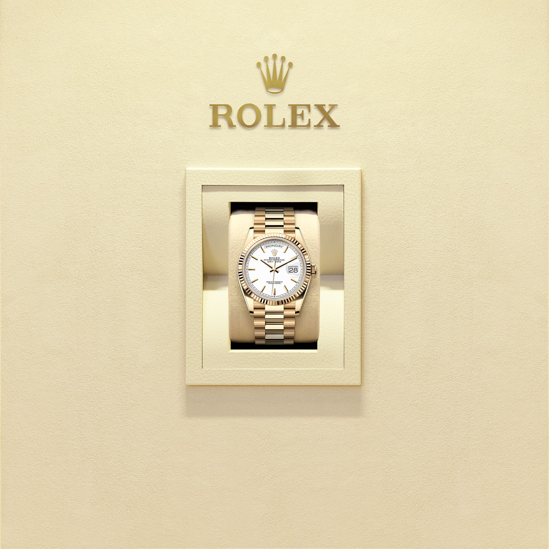蚝式恒动星期日历型 36腕表18K黄金款,搭配白色表盘、三角坑纹外圈及元首型(President)表带。