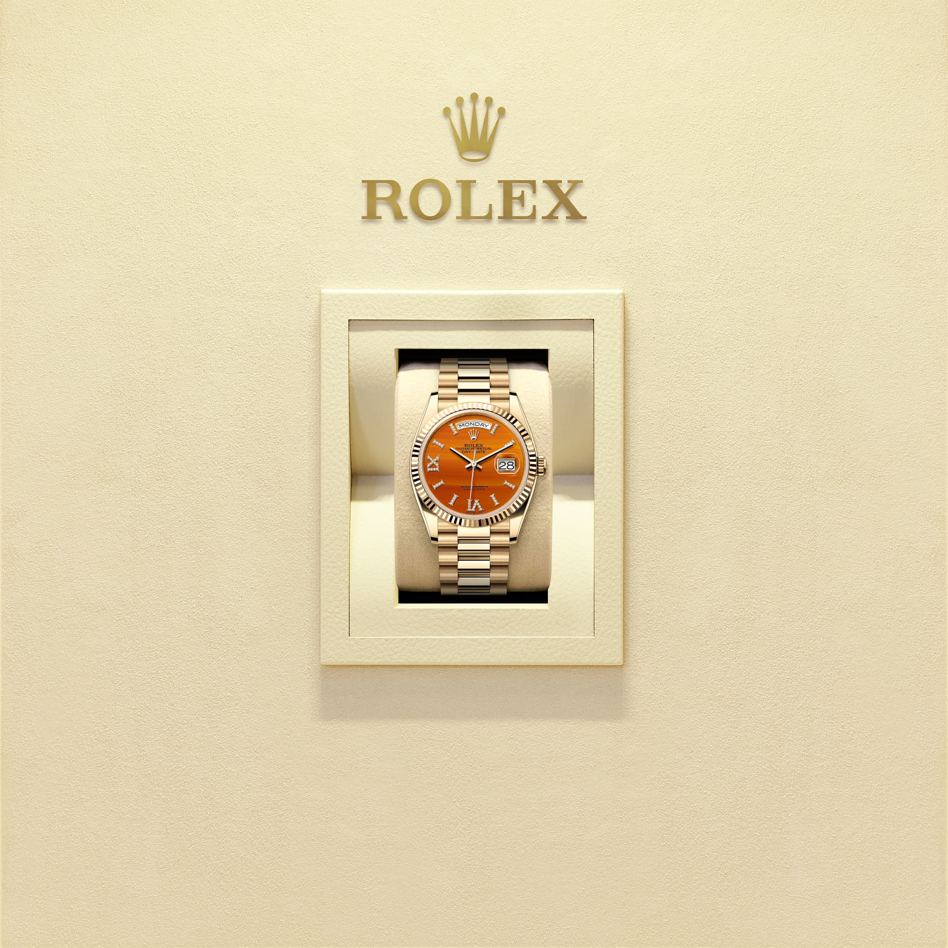 蚝式恒动星期日历型 36腕表18K黄金款,搭配镶钻红玉髓表盘、三角坑纹外圈及元首型(President)表带。