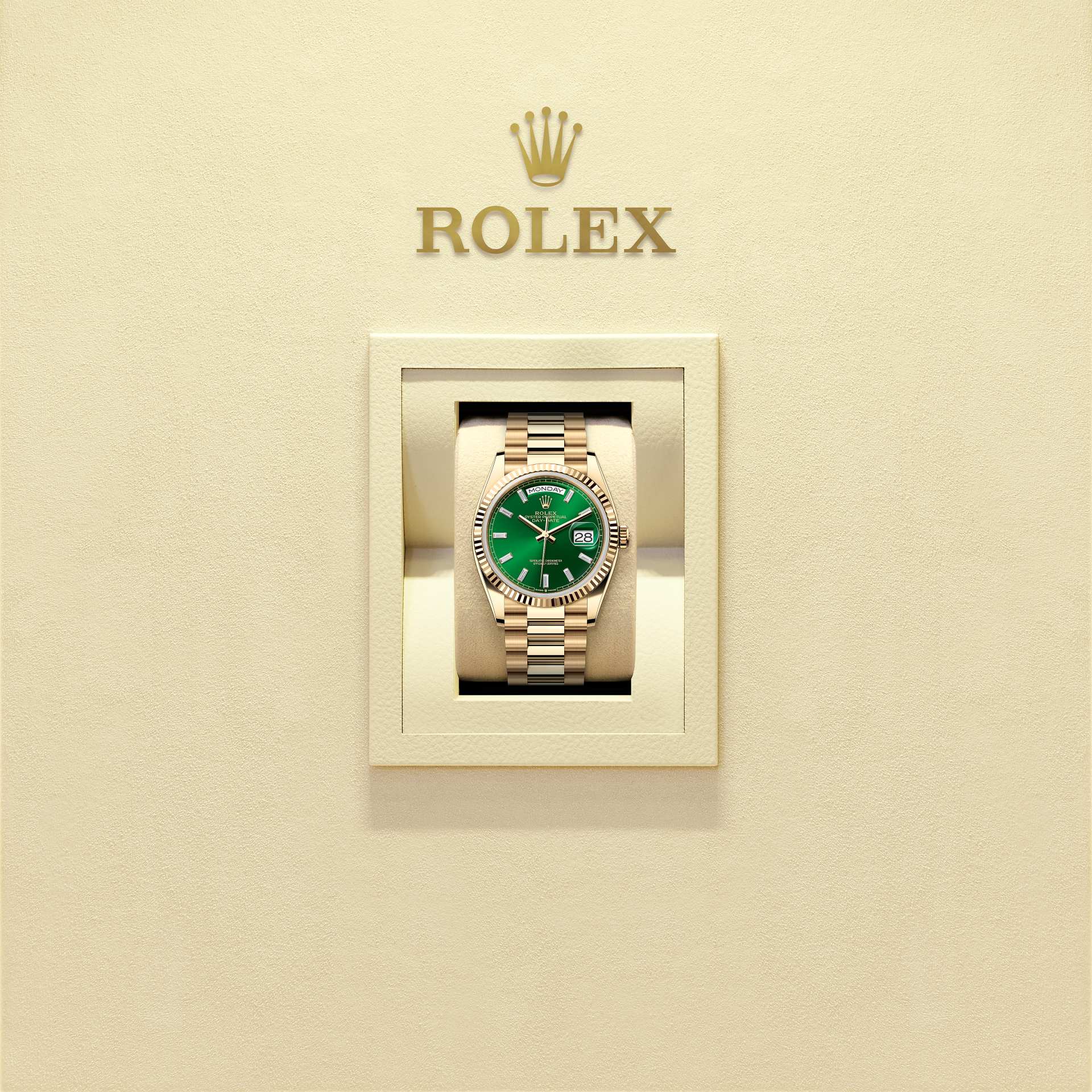 蚝式恒动星期日历型 36腕表18K黄金款,搭配镶钻亮绿色表盘、三角坑纹外圈及元首型(President)表带。
