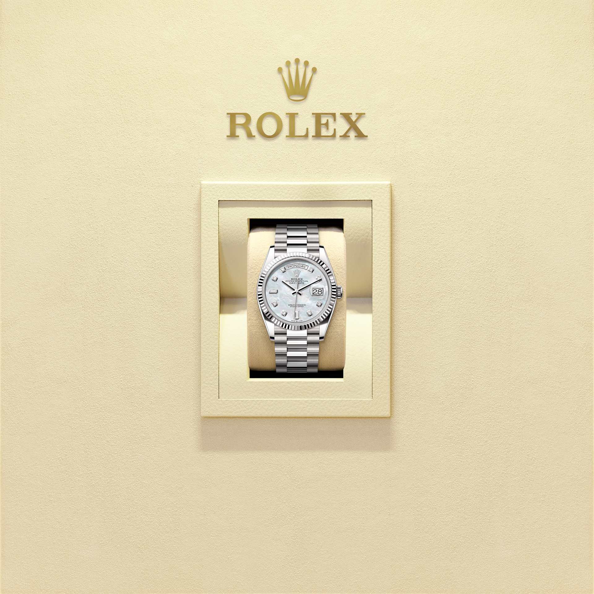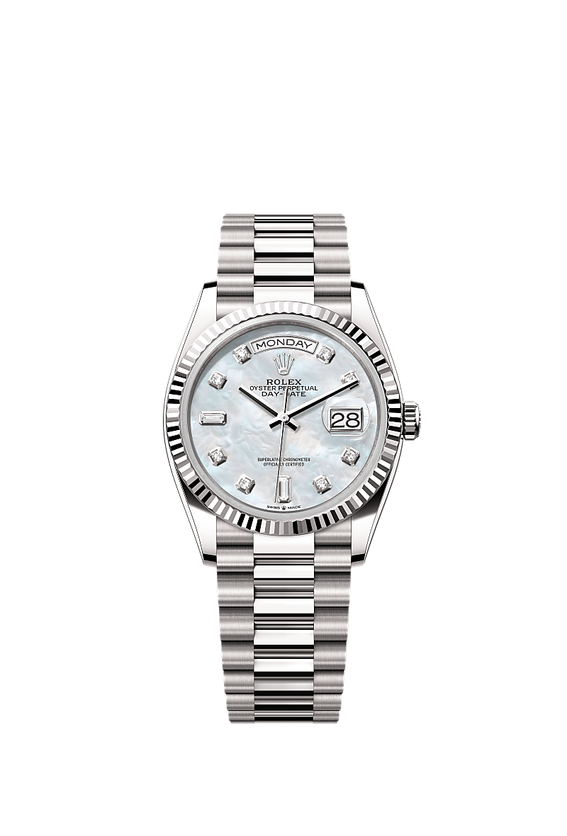 蚝式恒动星期日历型 36腕表18K白色黄金款,搭配镶钻白色珍珠母表盘、三角坑纹外圈及元首型(President)表带。