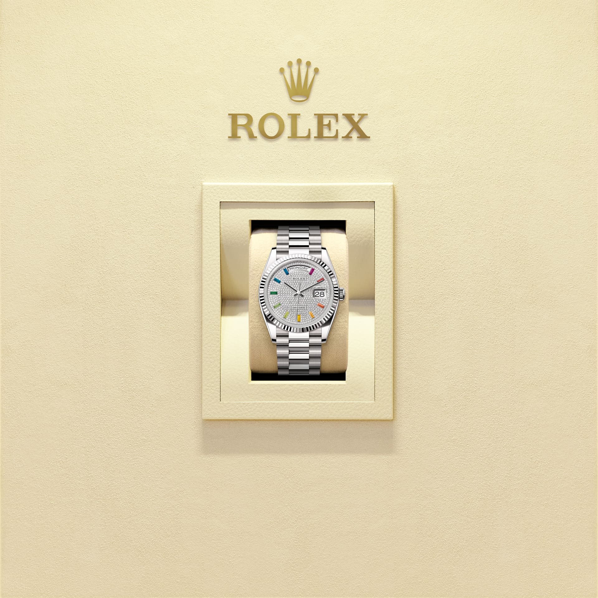表盘设有10颗方形切割彩虹渐变色蓝宝石。劳力士精心挑选珍罕尊贵的钻石、蓝宝石、红宝石、绿宝石,为腕表增添华美光彩。劳力士内部掌握宝石镶嵌的专业技术和精密设备,因此腕表的镶嵌工作均在内部进行。