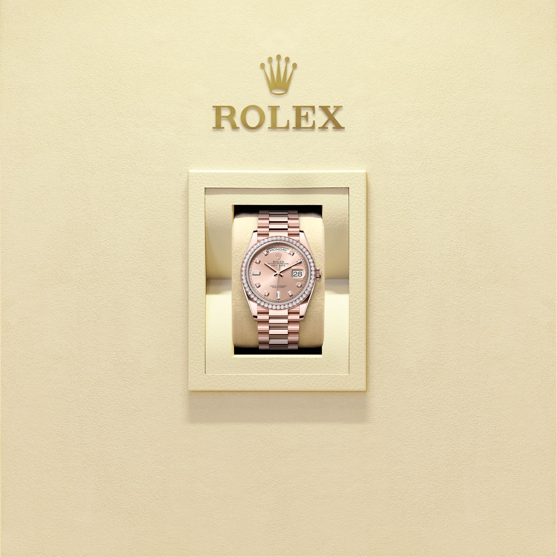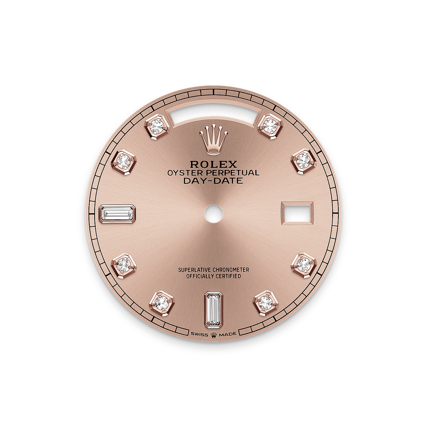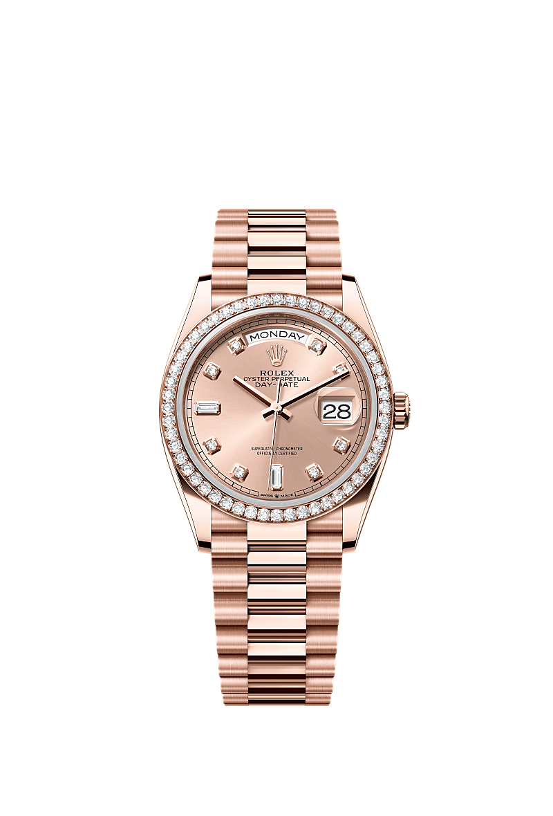 蚝式恒动星期日历型 36腕表18K永恒玫瑰金款,搭配镶钻玫瑰金色表盘、镶钻外圈及元首型(President)表带。