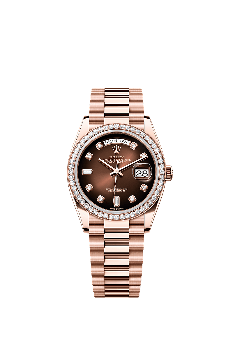 蚝式恒动星期日历型 36腕表18K永恒玫瑰金款,搭配镶钻渐变棕色表盘、镶钻外圈及元首型(President)表带。