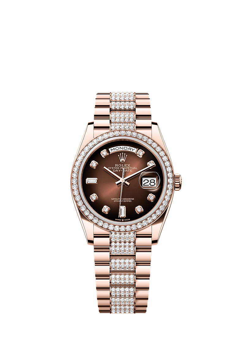 蚝式恒动星期日历型 36腕表18K永恒玫瑰金款,搭配镶钻渐变棕色表盘、镶钻外圈及镶钻元首型(President)表带。