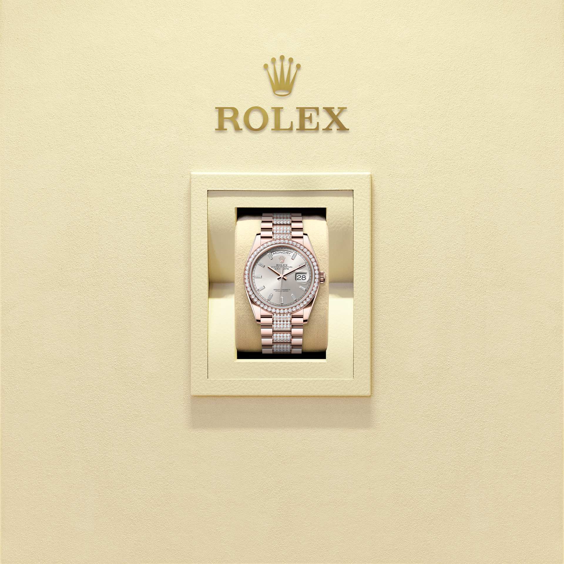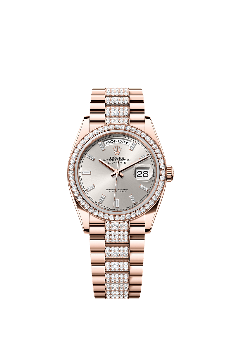 蚝式恒动星期日历型 36腕表18K永恒玫瑰金款,搭配镶钻银色表盘、镶钻外圈及镶钻元首型(President)表带。