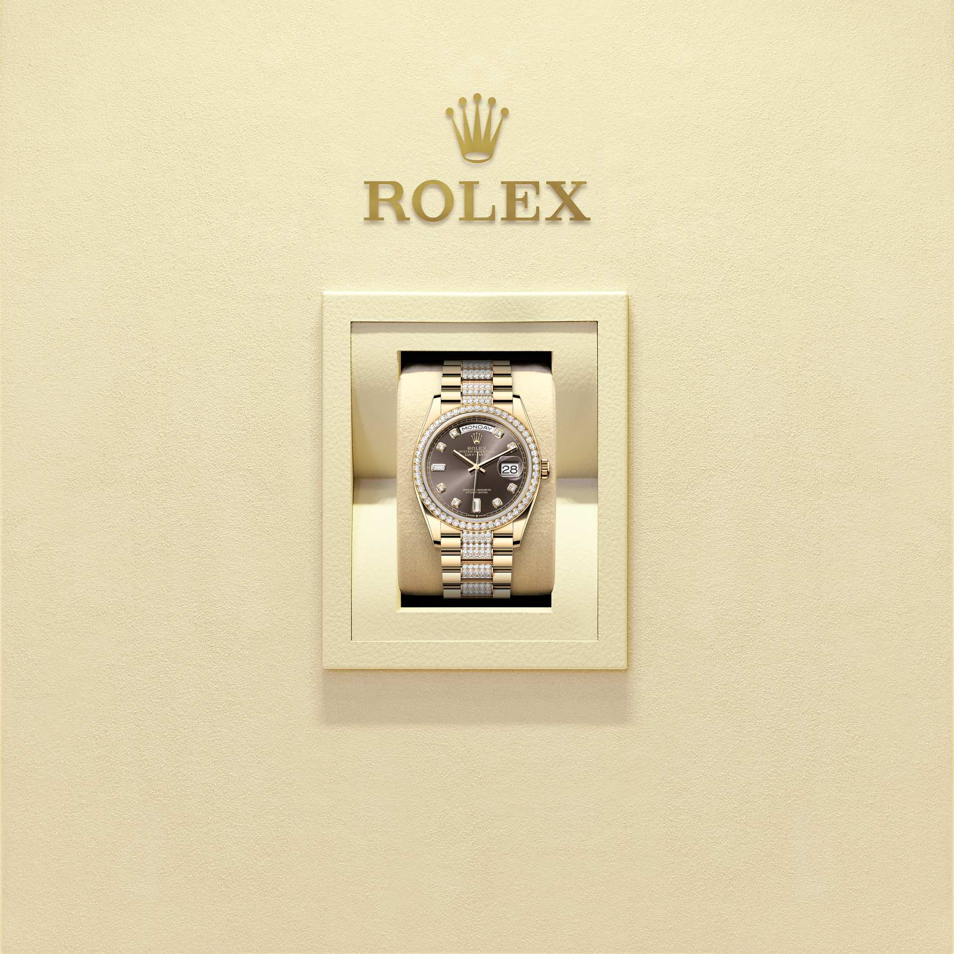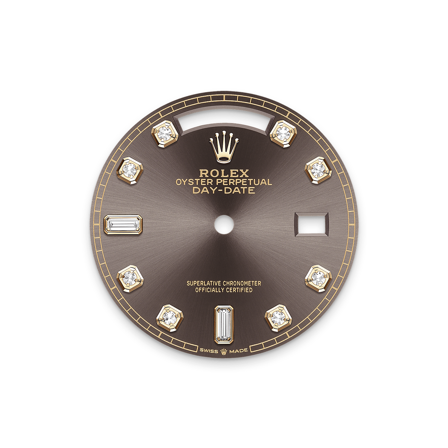 表盘设有18K金底座镶托钻石,6及9点钟位置镶方形钻石。蚝式系列的许多表盘款式均采用太阳光线效果,折射出淡雅光泽。这种效果需要超卓的刷光技术,打造从表盘中央往外扩展的刻纹。