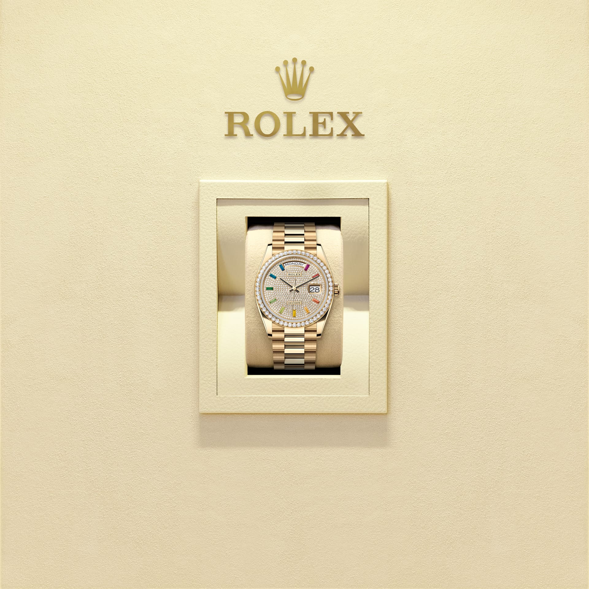 蚝式恒动星期日历型 36腕表18K黄金款,搭配密镶钻石表盘、镶钻外圈及元首型(President)表带。