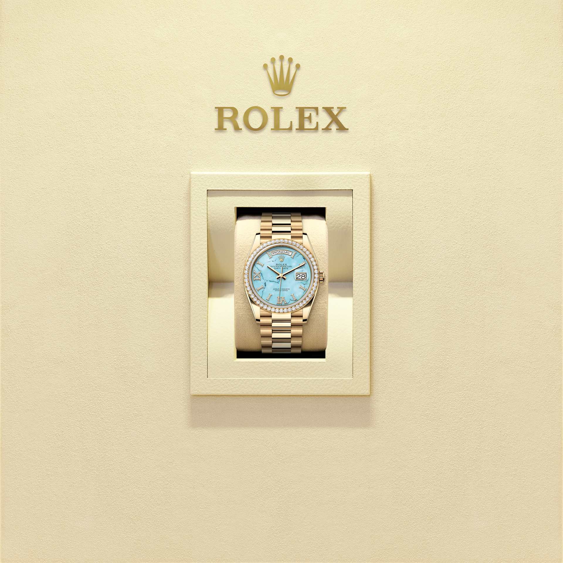 蚝式恒动星期日历型 36腕表18K黄金款,搭配镶钻绿松石表盘、镶钻外圈及元首型(President)表带。
