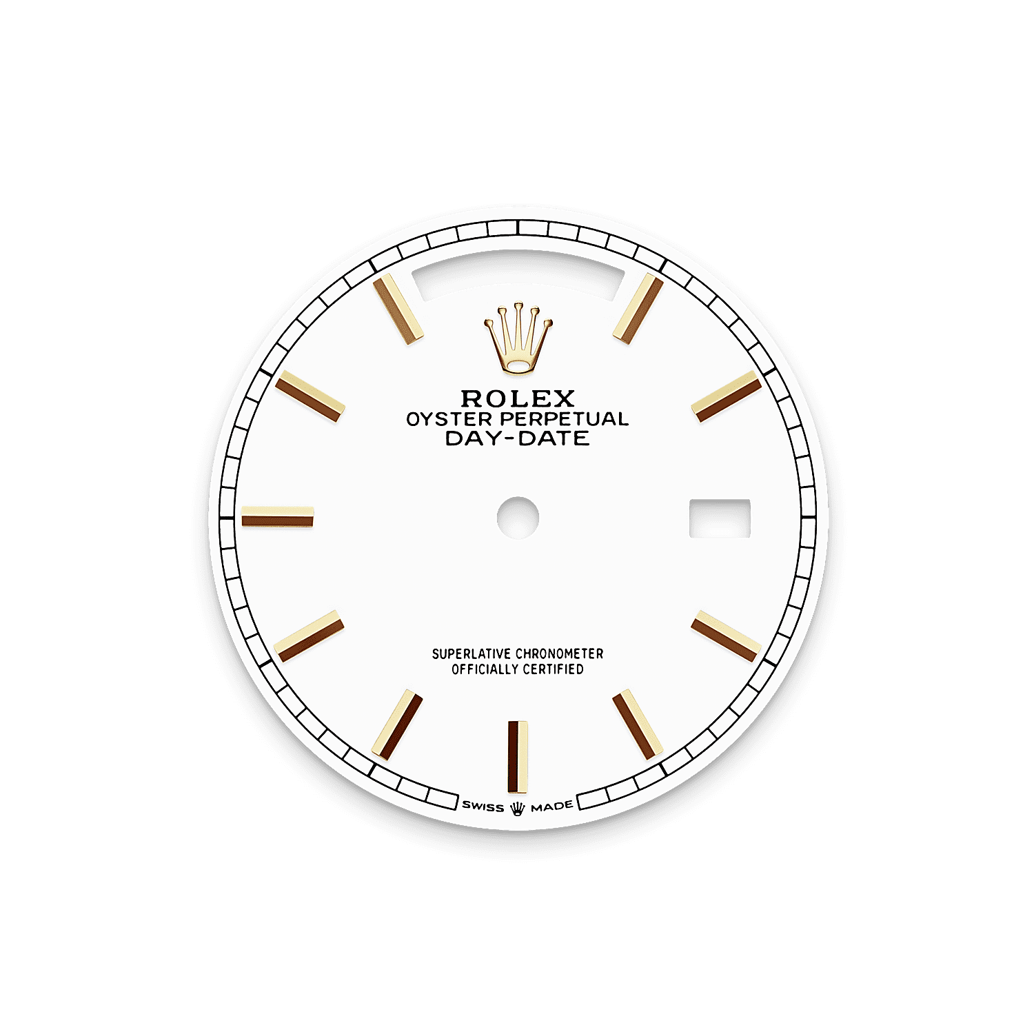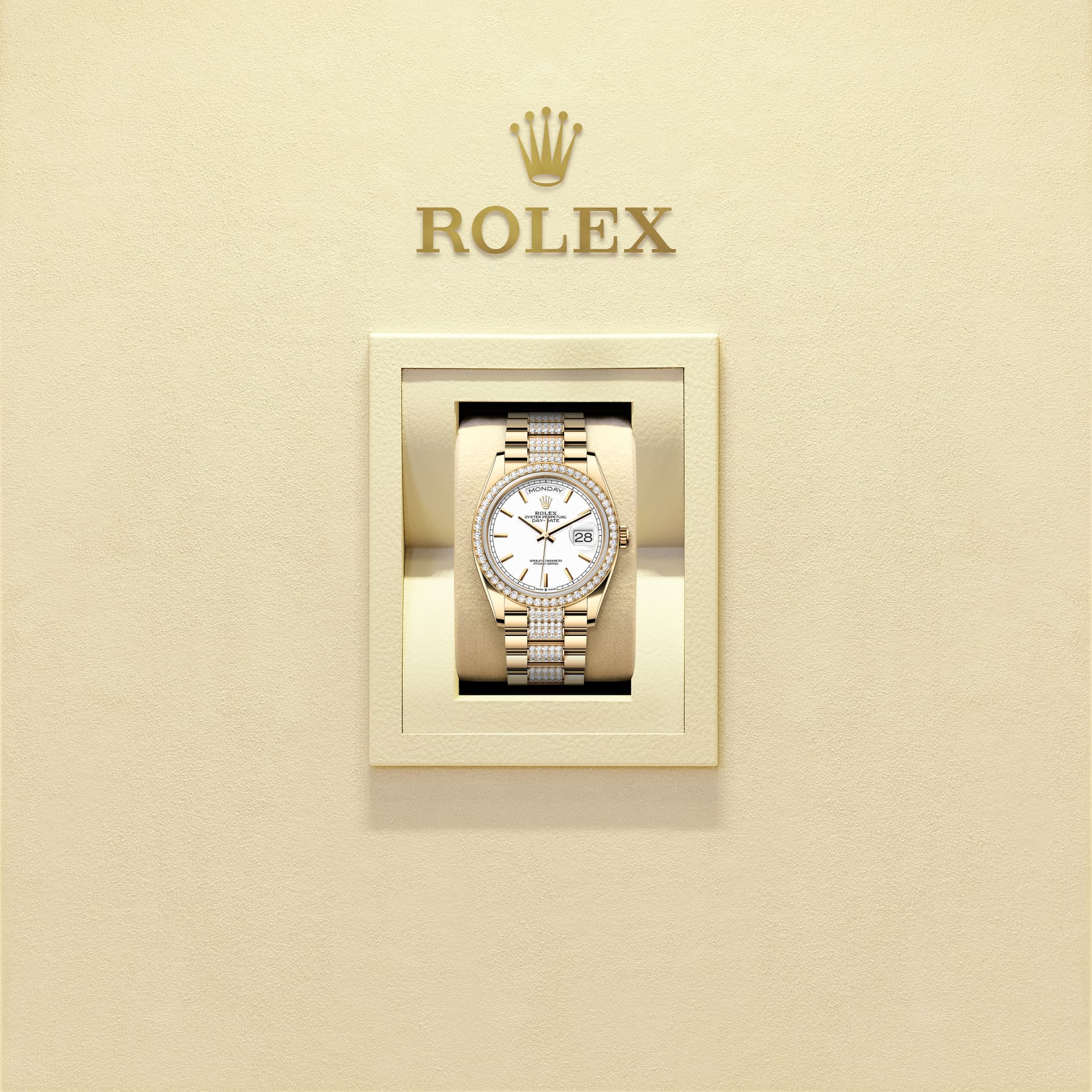 蚝式恒动星期日历型 36腕表18K黄金款,搭配白色表盘、镶钻外圈及镶钻元首型(President)表带。