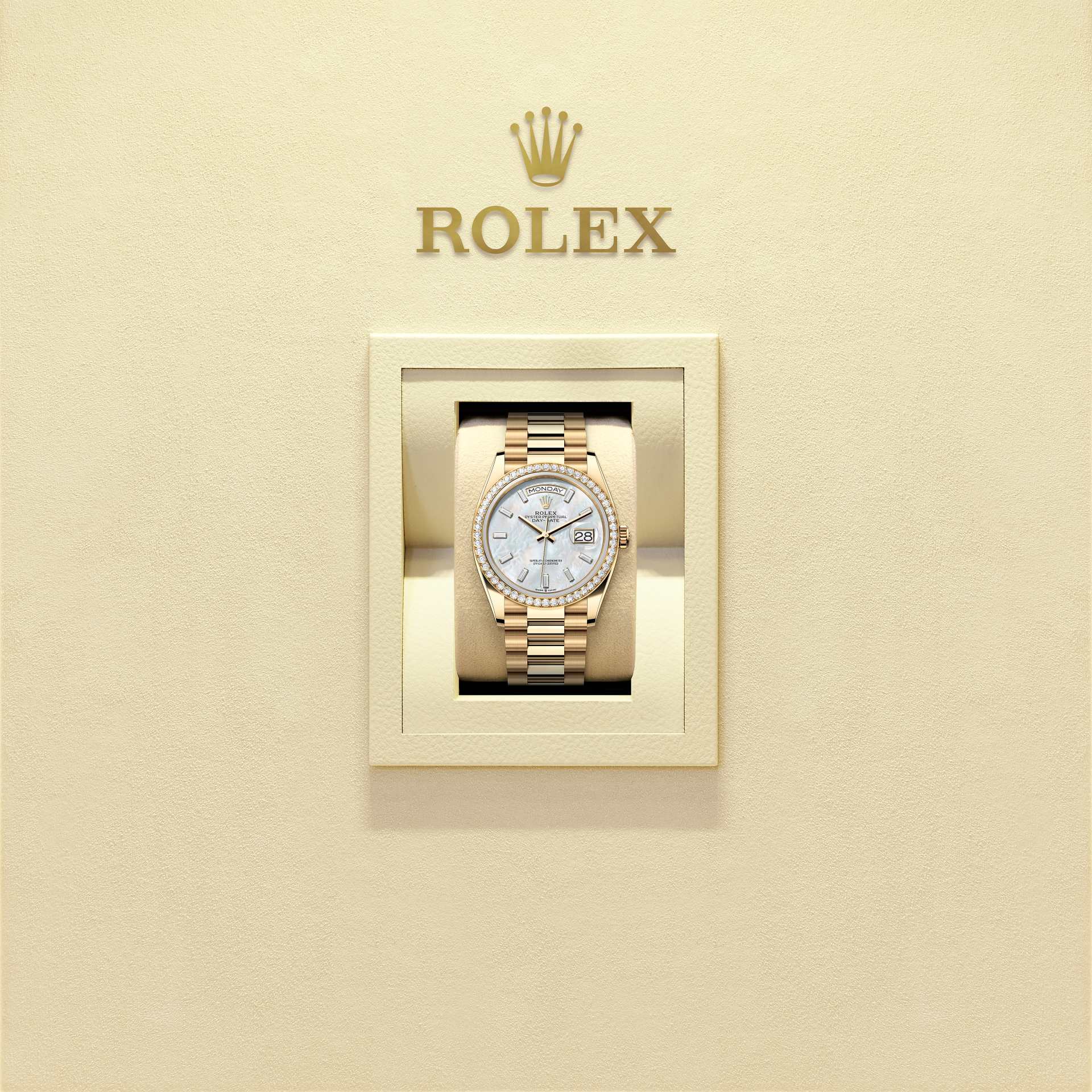 蚝式恒动星期日历型 36腕表18K黄金款,搭配镶钻白色珍珠母表盘、镶钻外圈及元首型(President)表带。