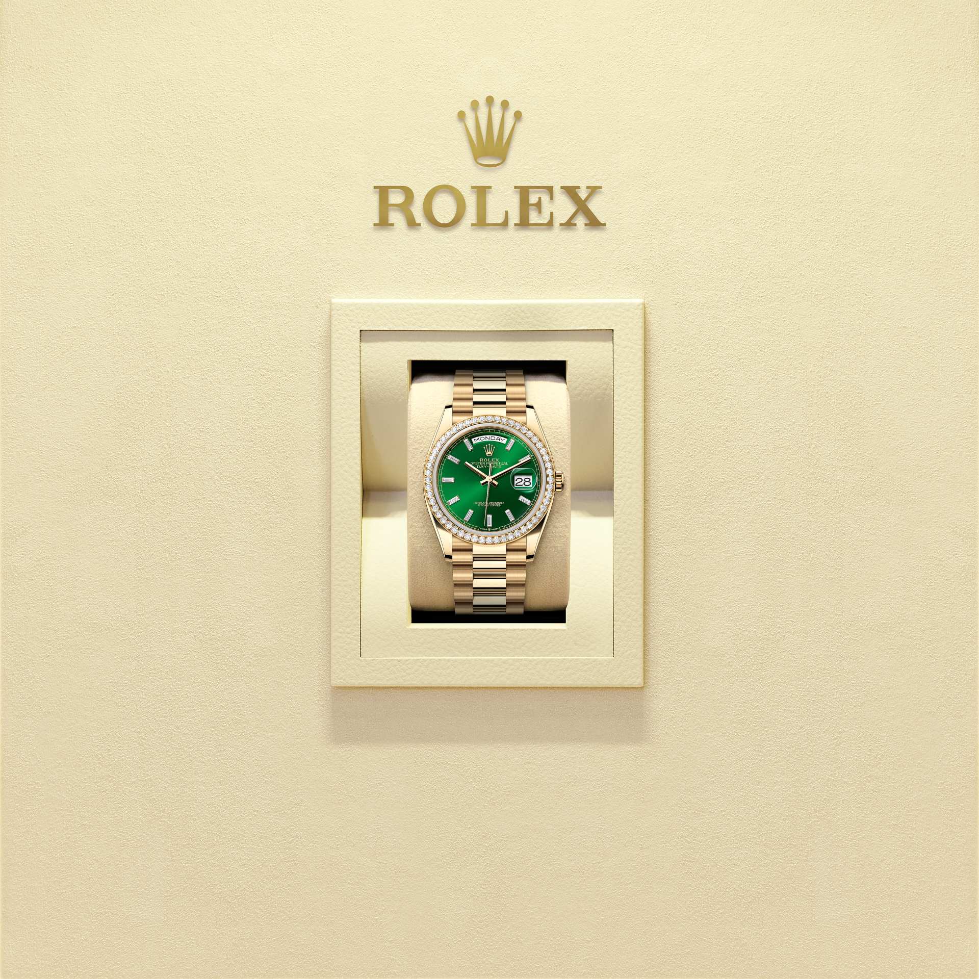 蚝式恒动星期日历型 36腕表18K黄金款,搭配镶钻亮绿色表盘、镶钻外圈及元首型(President)表带。