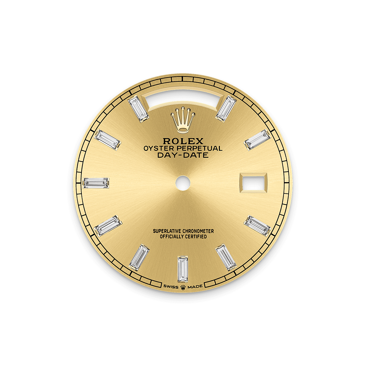 表盘设有10颗方形切割钻石。蚝式系列的许多表盘款式均采用太阳光线效果,折射出淡雅光泽。这种效果需要超卓的刷光技术,打造从表盘中央往外扩展的刻纹。