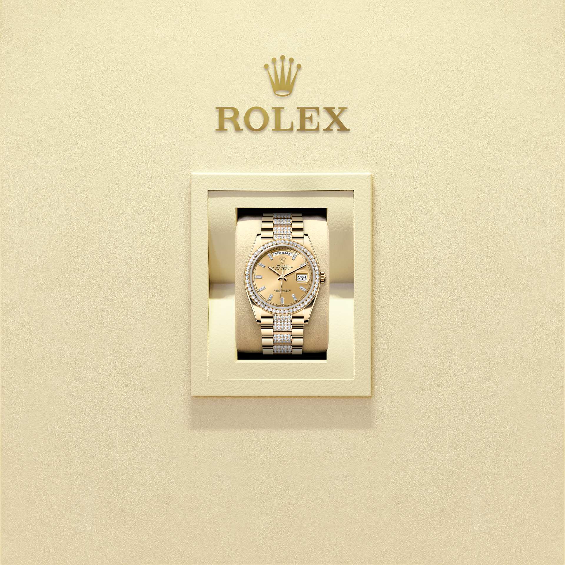 蚝式恒动星期日历型 36腕表18K黄金款,搭配镶钻香槟色表盘、镶钻外圈及镶钻元首型(President)表带。