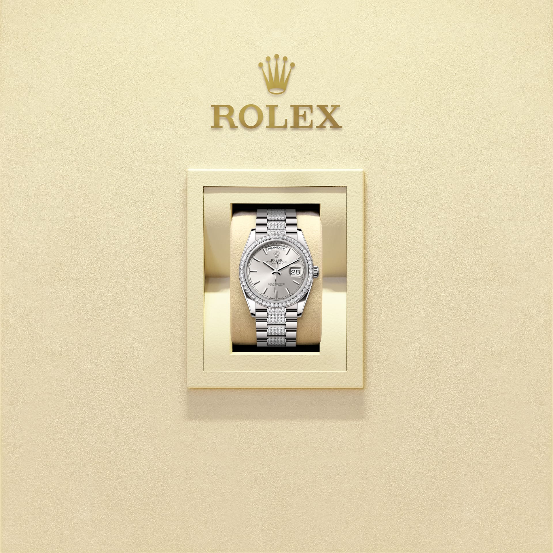 蚝式恒动星期日历型 36腕表18K白色黄金款,搭配银色表盘、镶钻外圈及镶钻元首型(President)表带。