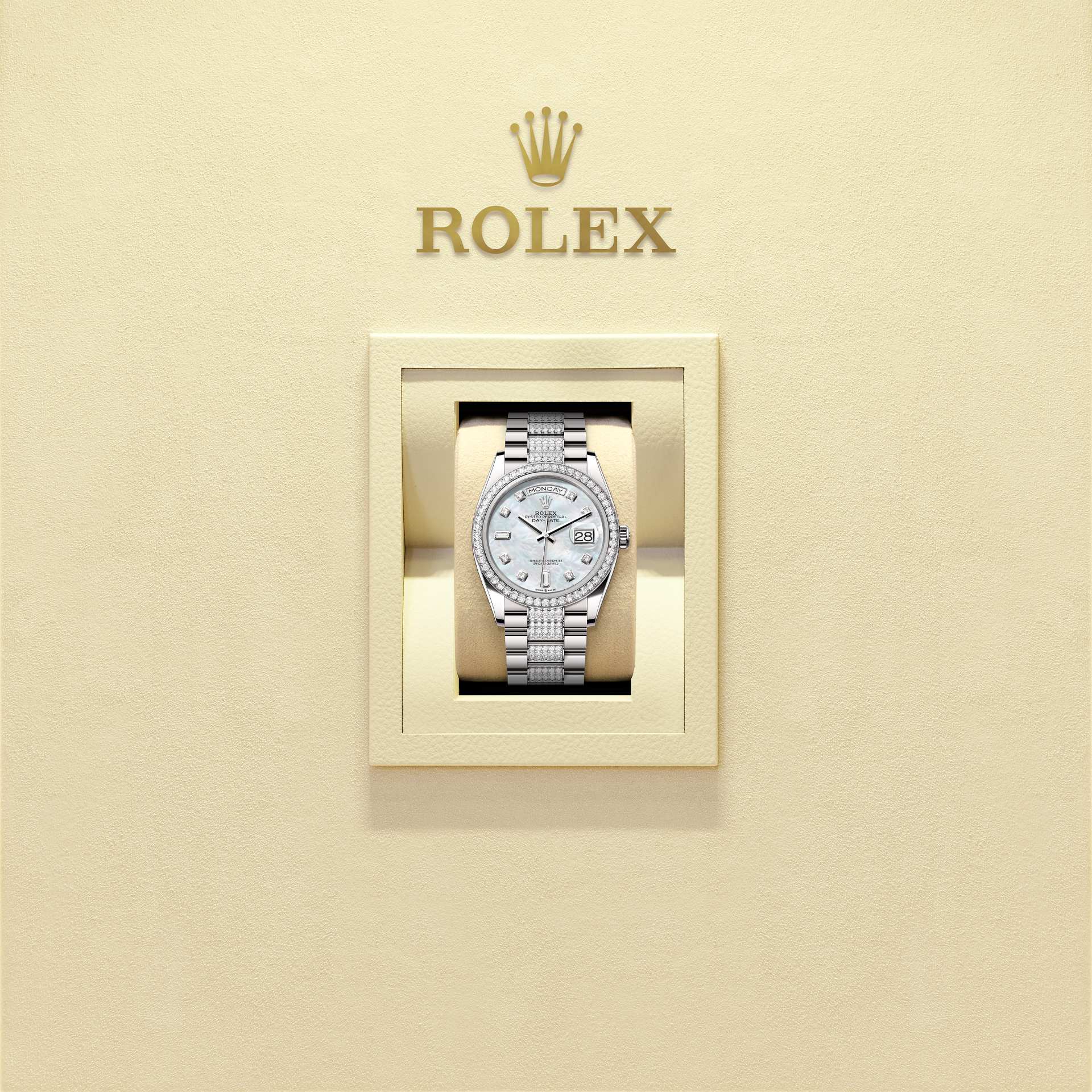 蚝式恒动星期日历型 36腕表18K白色黄金款,搭配镶钻白色珍珠母表盘、镶钻外圈及镶钻元首型(President)表带。