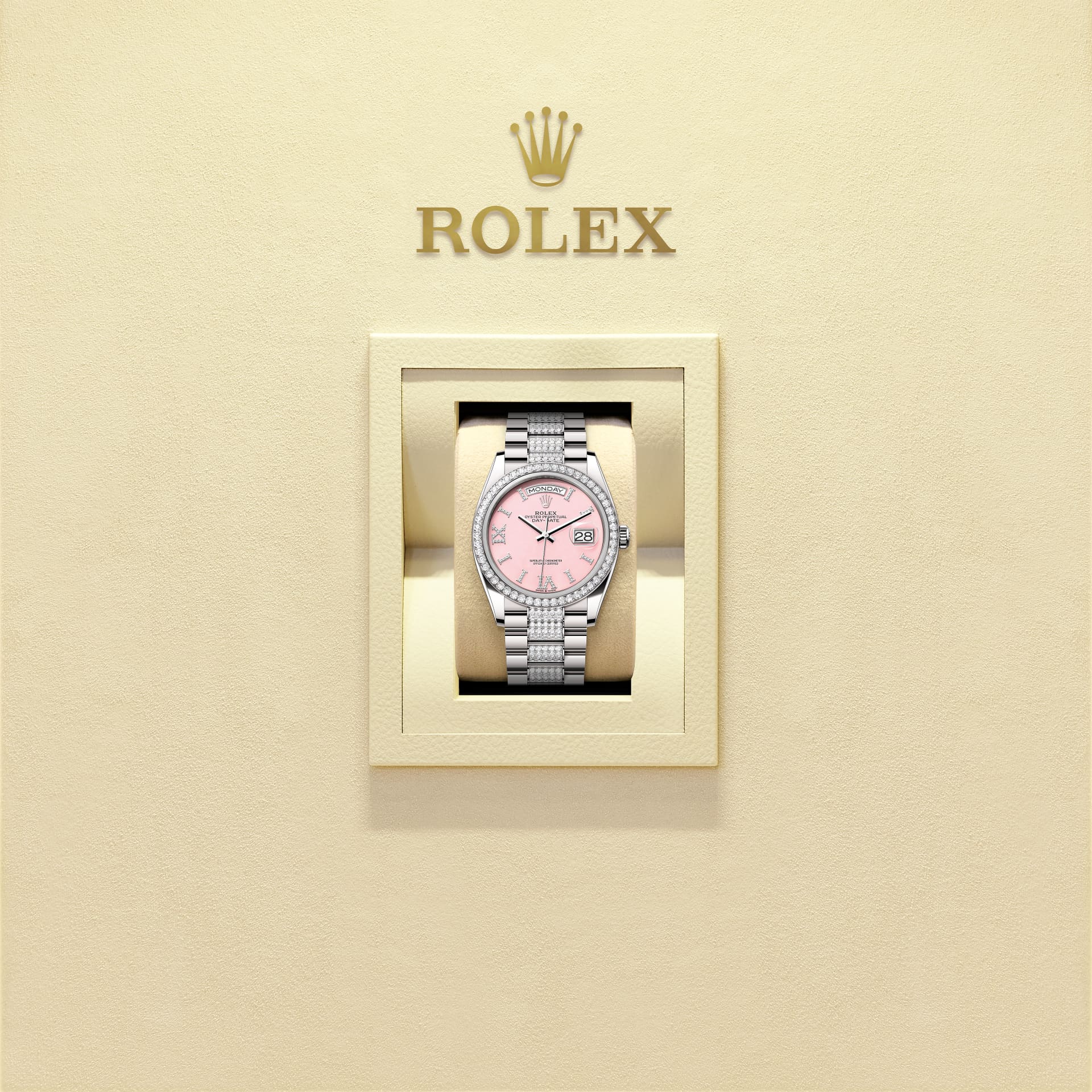 蚝式恒动星期日历型 36腕表18K白色黄金款,搭配镶钻粉红色蛋白石表盘、镶钻外圈及镶钻元首型(President)表带。