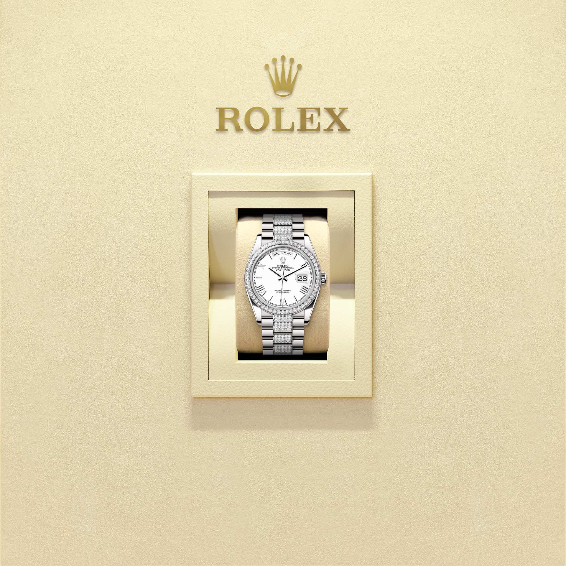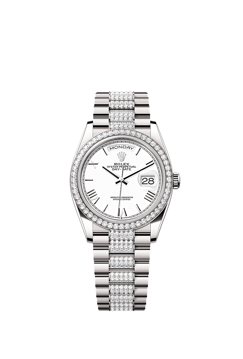 蚝式恒动星期日历型 36腕表18K白色黄金款,搭配白色表盘、镶钻外圈及镶钻元首型(President)表带。