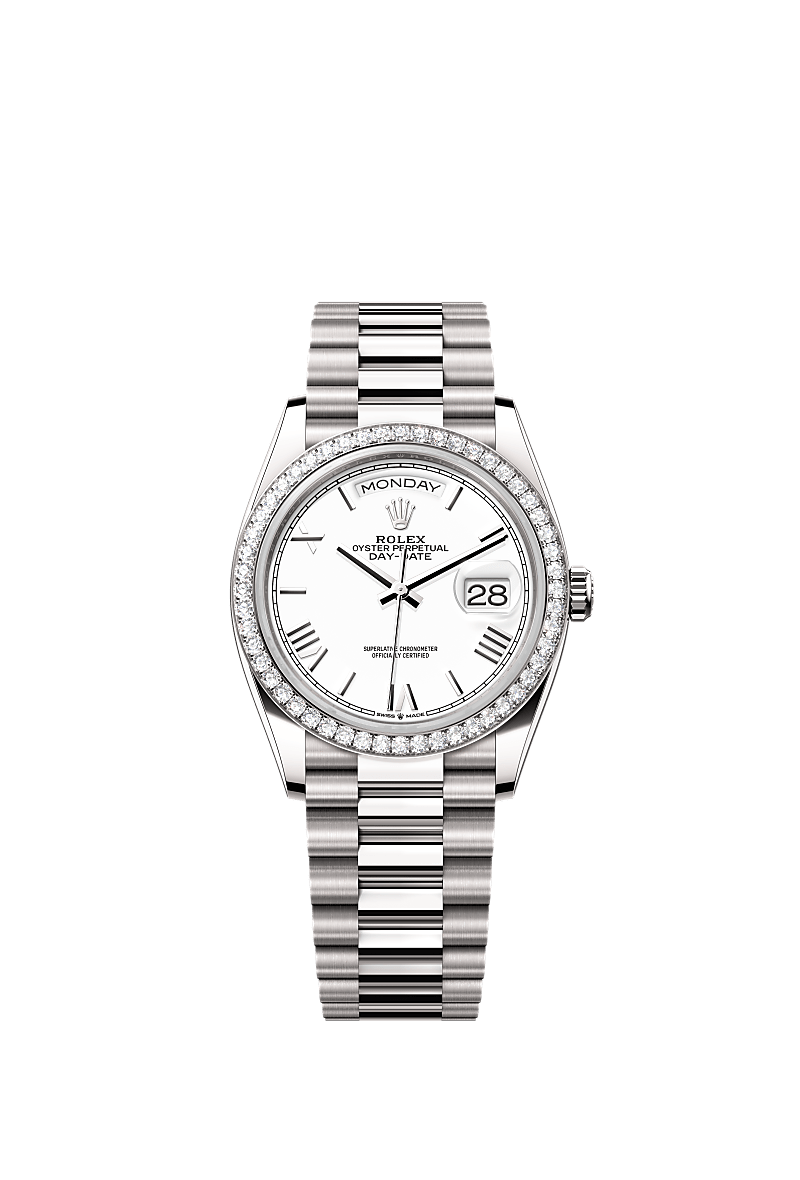 蚝式恒动星期日历型 36腕表18K白色黄金款,搭配白色表盘、镶钻外圈及元首型(President)表带。