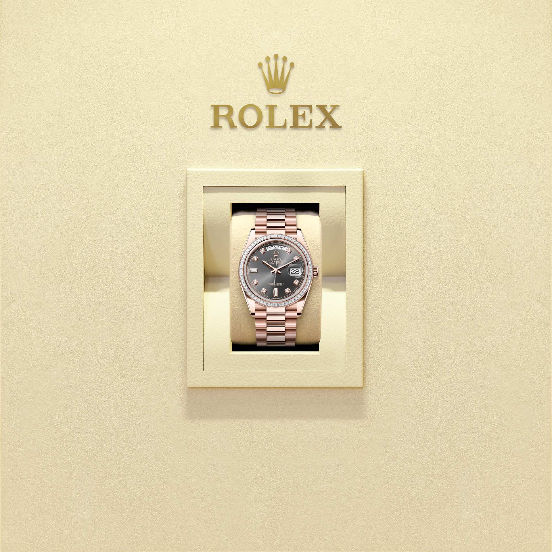 蚝式恒动星期日历型 36腕表18K永恒玫瑰金款,搭配镶钻石板灰色表盘、镶钻外圈及元首型(President)表带。