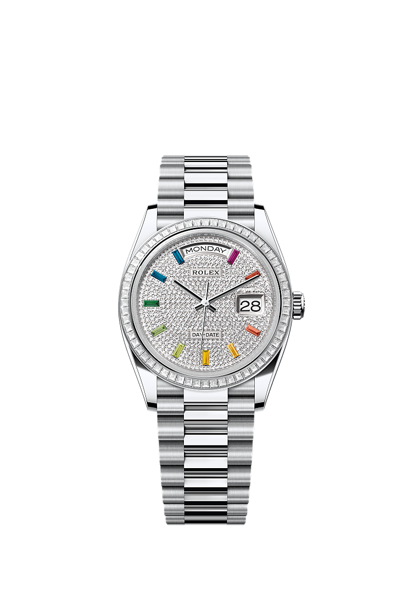 蚝式恒动星期日历型 36腕表铂金款,搭配密镶钻石表盘、镶钻外圈及元首型(President)表带。
