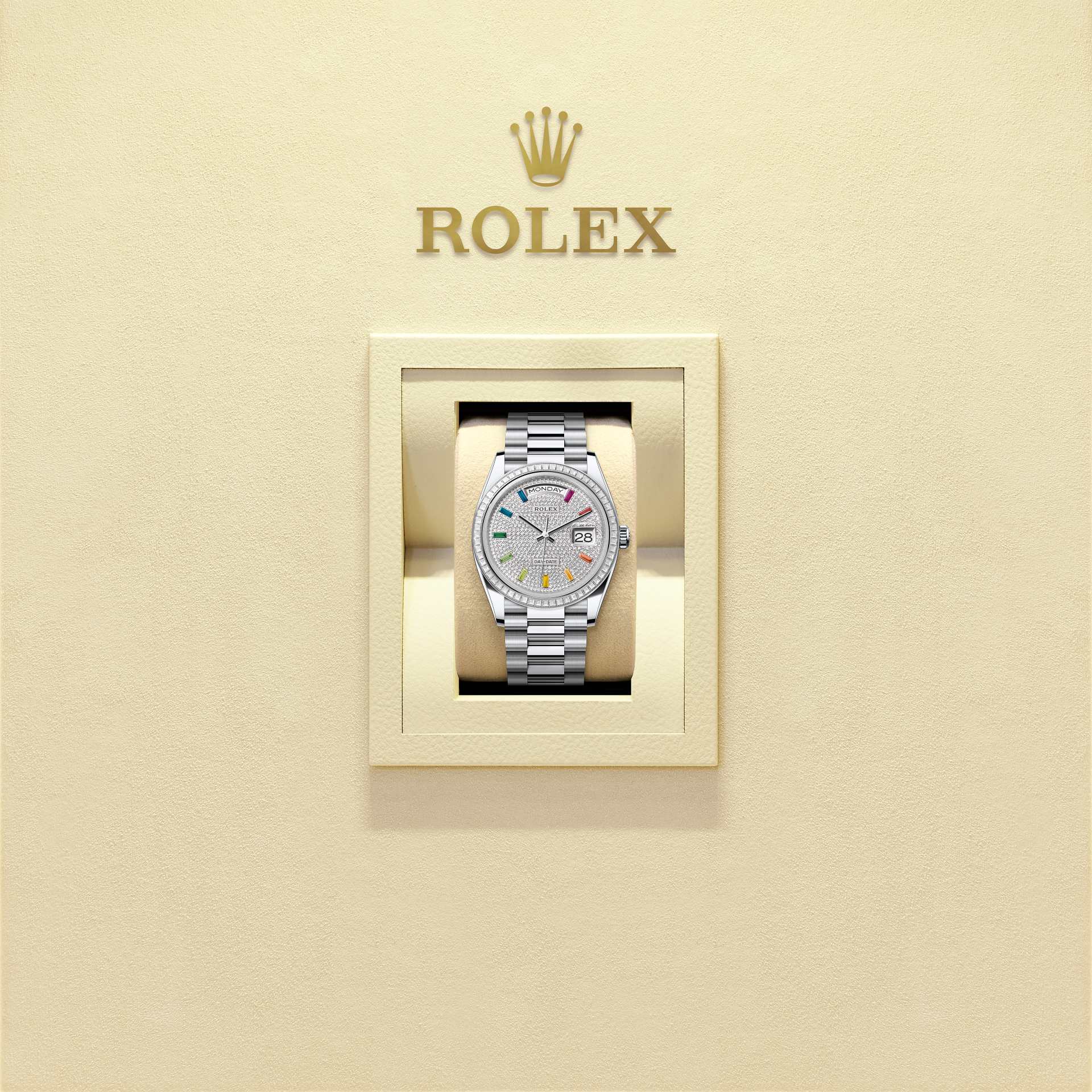 表盘设有10颗方形切割彩虹渐变色蓝宝石。劳力士精心挑选珍罕尊贵的钻石、蓝宝石、红宝石、绿宝石,为腕表增添华美光彩。劳力士内部掌握宝石镶嵌的专业技术和精密设备,因此腕表的镶嵌工作均在内部进行。
