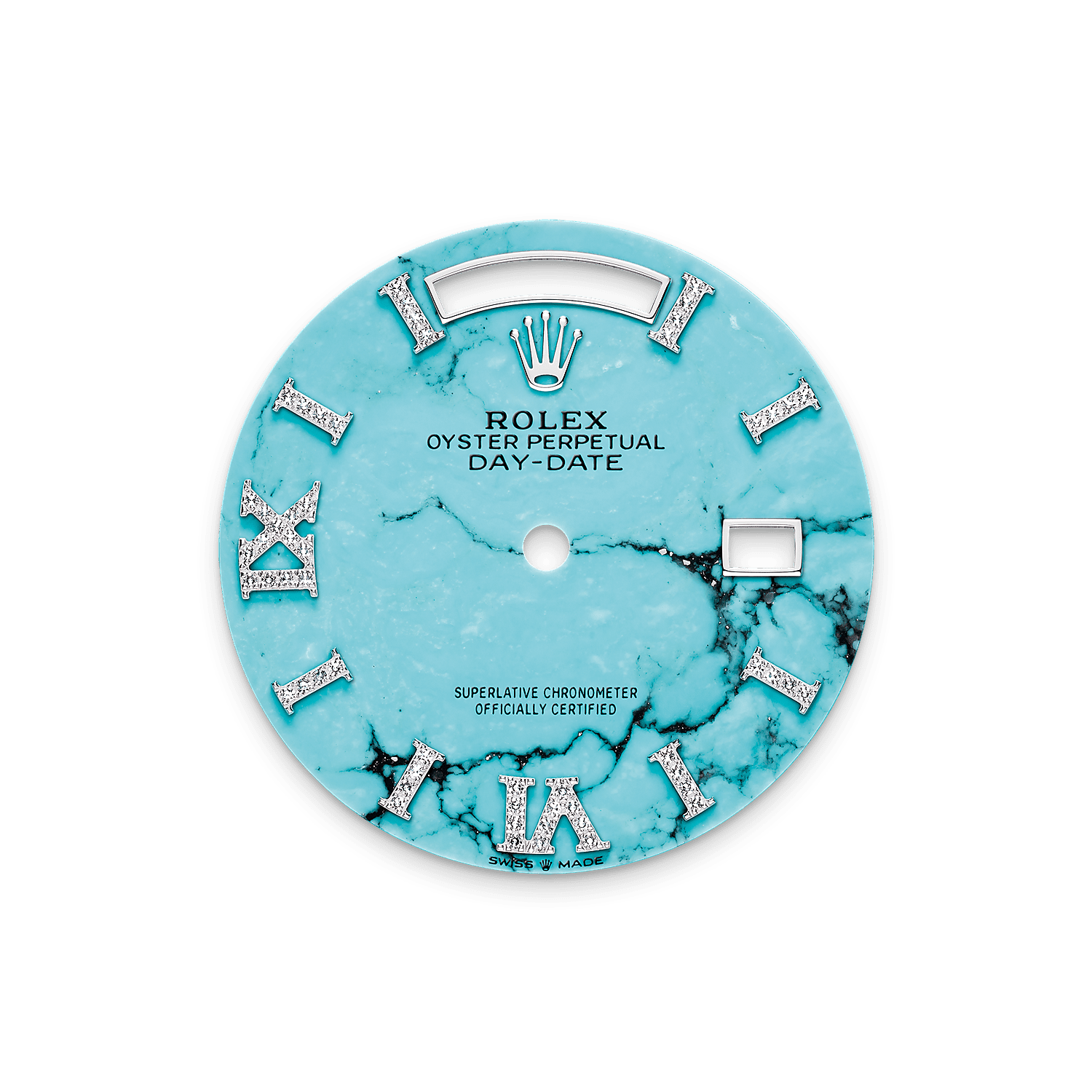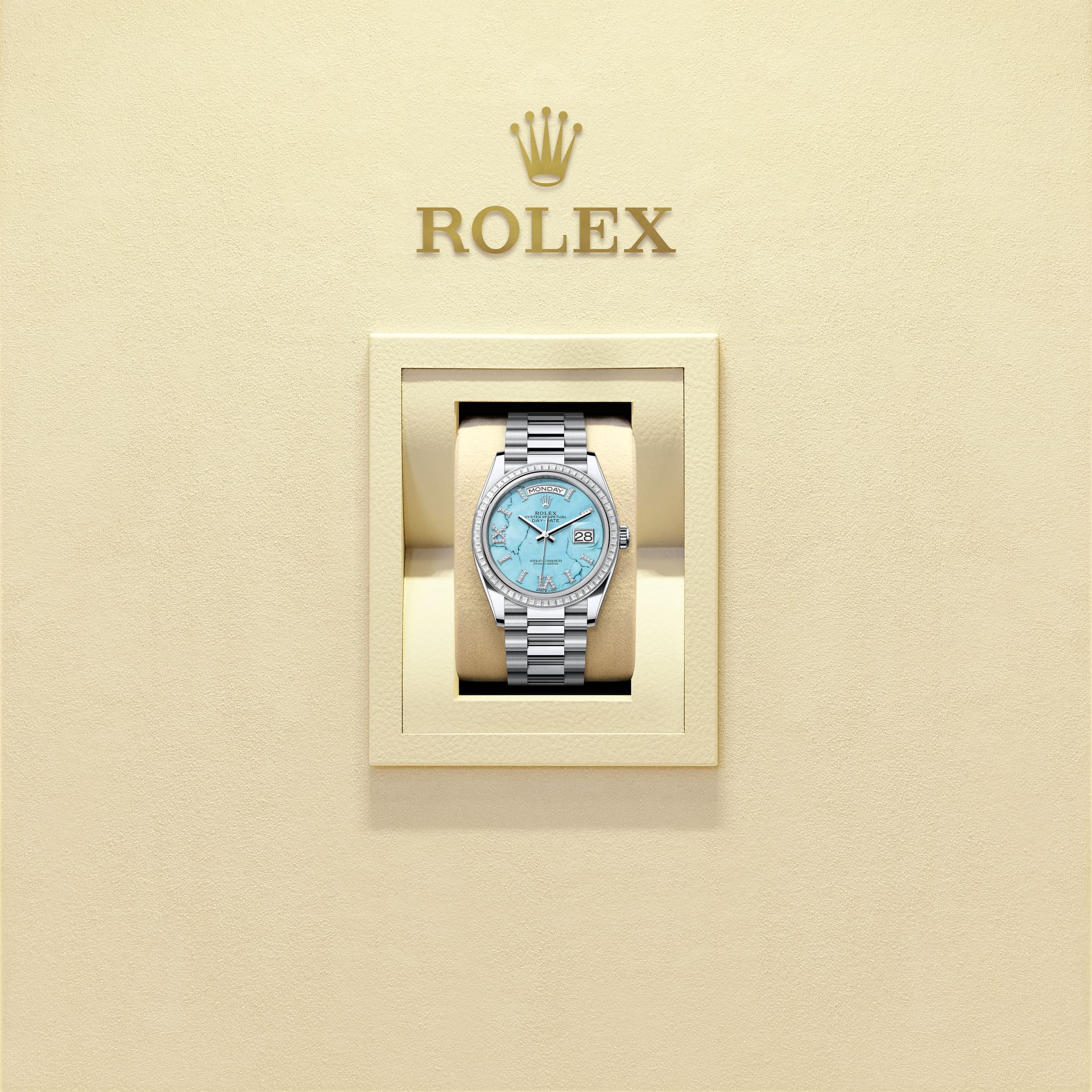 蚝式恒动星期日历型 36腕表铂金款,搭配镶钻绿松石表盘、镶钻外圈及元首型(President)表带。