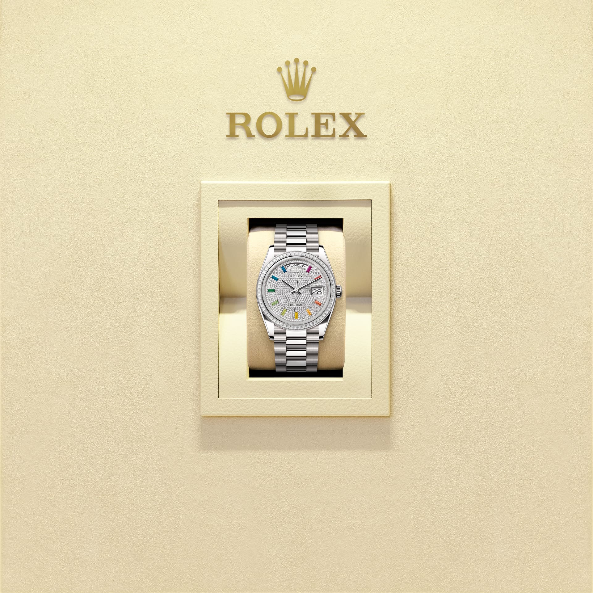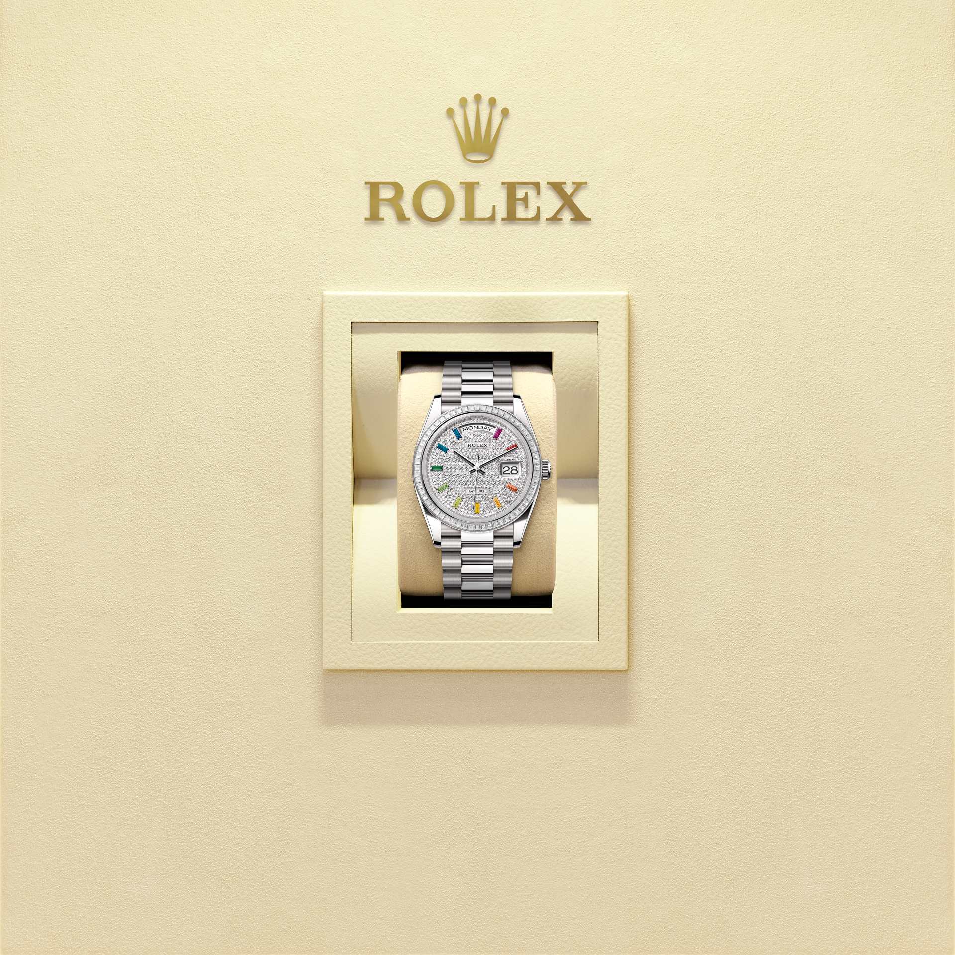 蚝式恒动星期日历型 36腕表18K白色黄金款,搭配密镶钻石表盘、镶钻外圈及元首型(President)表带。