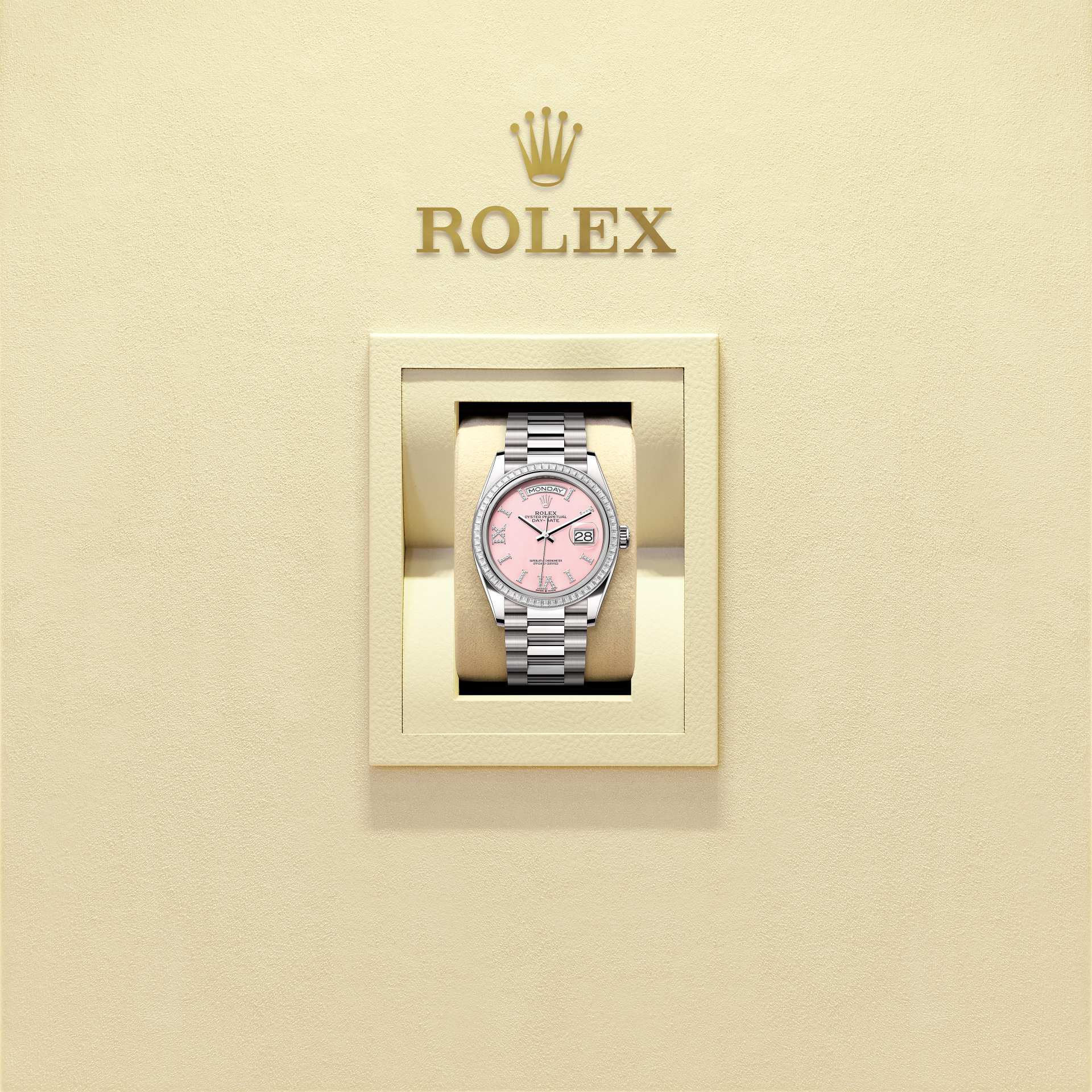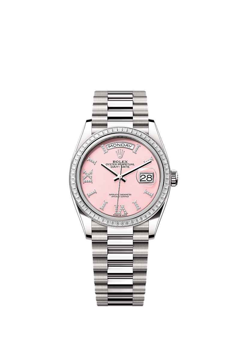蚝式恒动星期日历型 36腕表18K白色黄金款,搭配镶钻粉红色蛋白石表盘、镶钻外圈及元首型(President)表带。