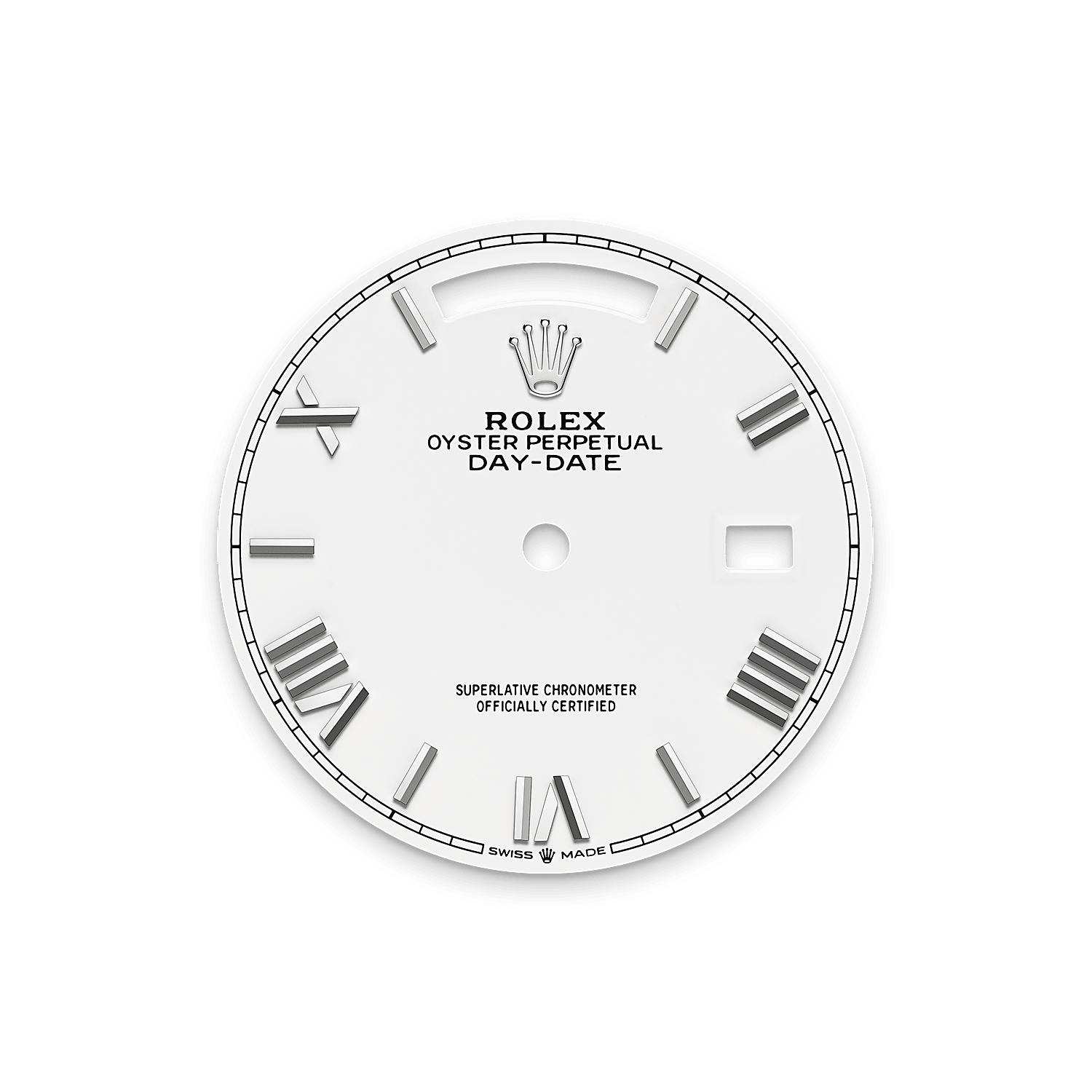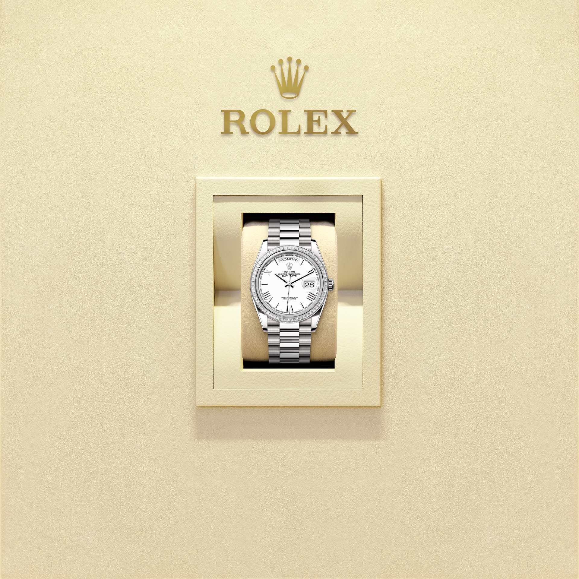 蚝式恒动星期日历型 36腕表18K白色黄金款,搭配白色表盘、镶钻外圈及元首型(President)表带。