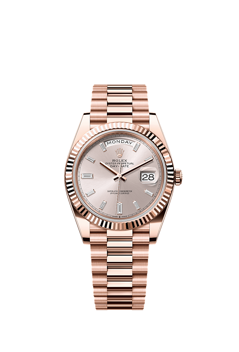 蚝式恒动星期日历型 40腕表18K永恒玫瑰金款,搭配镶钻日亮金色表盘、三角坑纹外圈及元首型(President)表带。