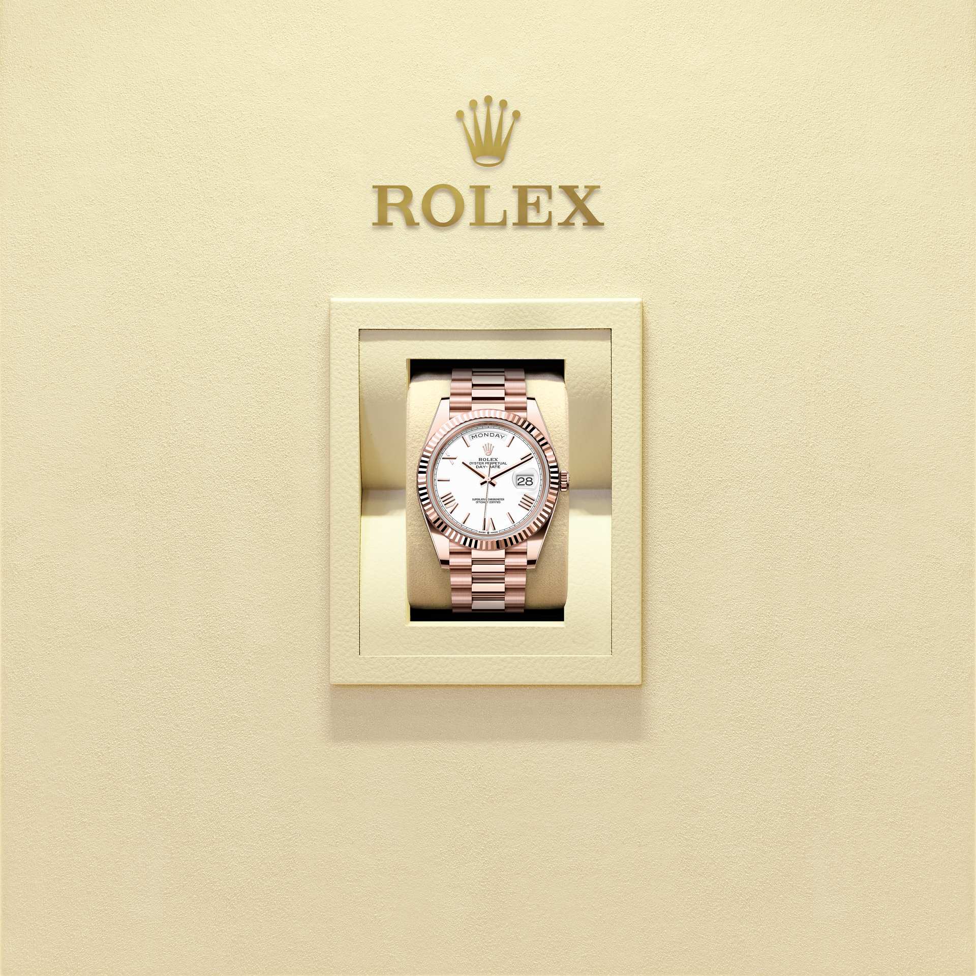 蚝式恒动星期日历型 40腕表18K永恒玫瑰金款,搭配白色表盘、三角坑纹外圈及元首型(President)表带。