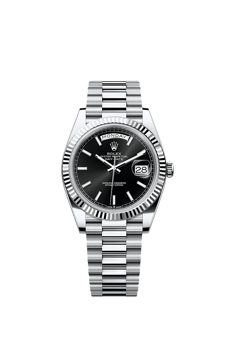 蚝式恒动星期日历型 40腕表铂金款,搭配亮黑色表盘、三角坑纹外圈及元首型(President)表带。