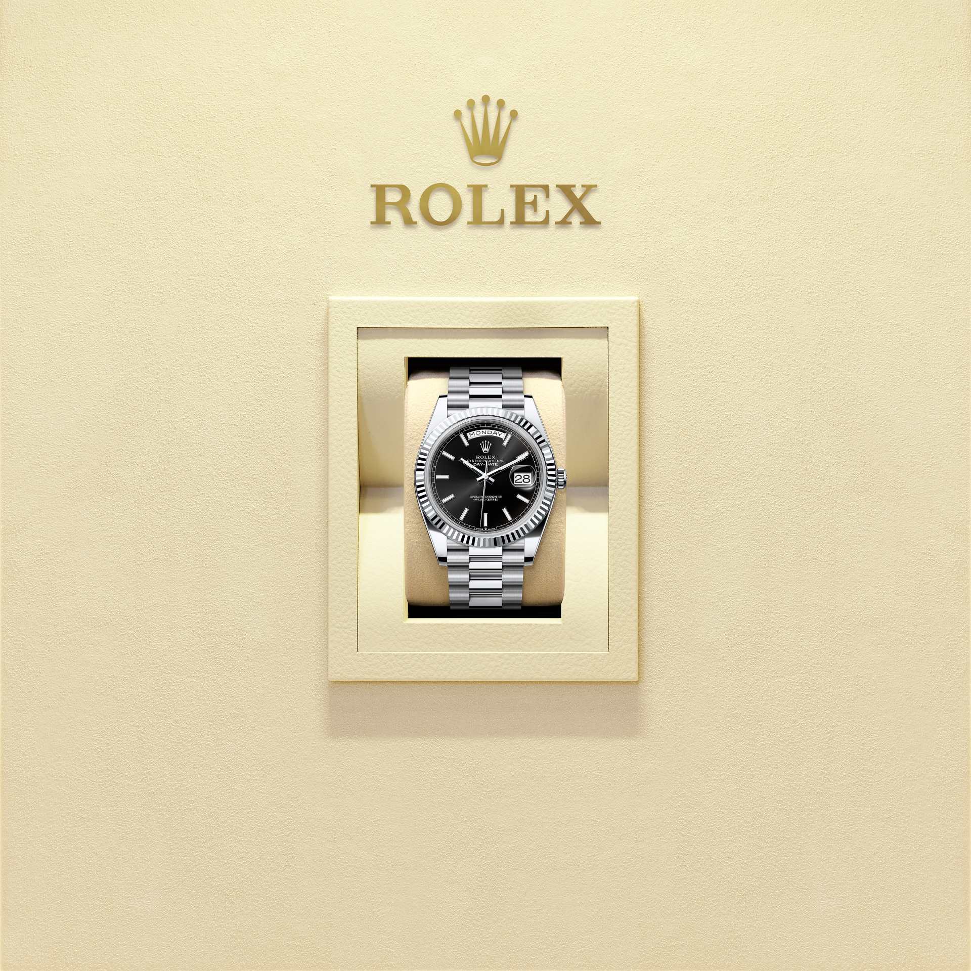而底盖上可见的坑纹设计亦出于同样目的,并以特定的劳力士工具旋紧于表壳。及后,三角坑纹演变为一项美学设计元素,堪为劳力士的经典特色。时至今日,三角坑纹成为品牌腕表的特色,这款星期日历型 40的外圈以铂金制成。