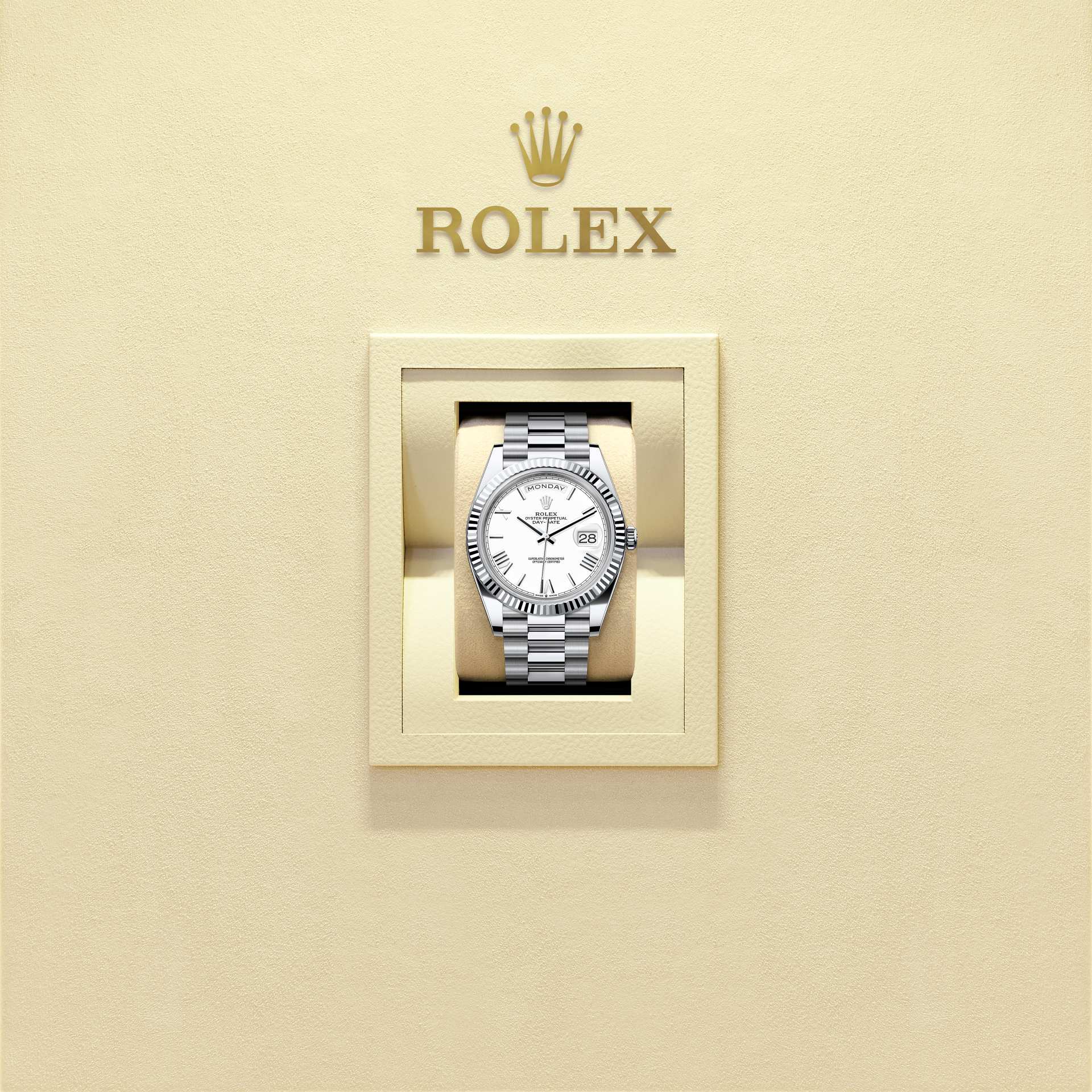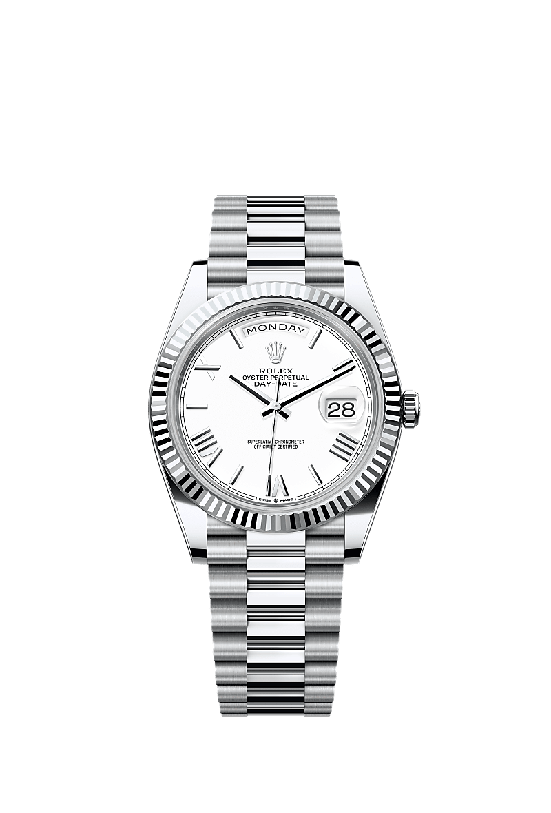 蚝式恒动星期日历型 40腕表铂金款,搭配白色表盘、三角坑纹外圈及元首型(President)表带。