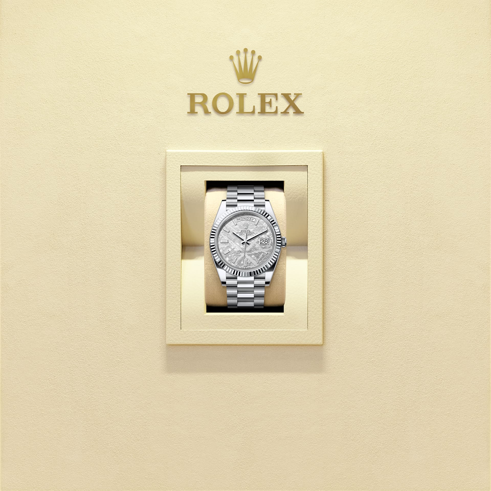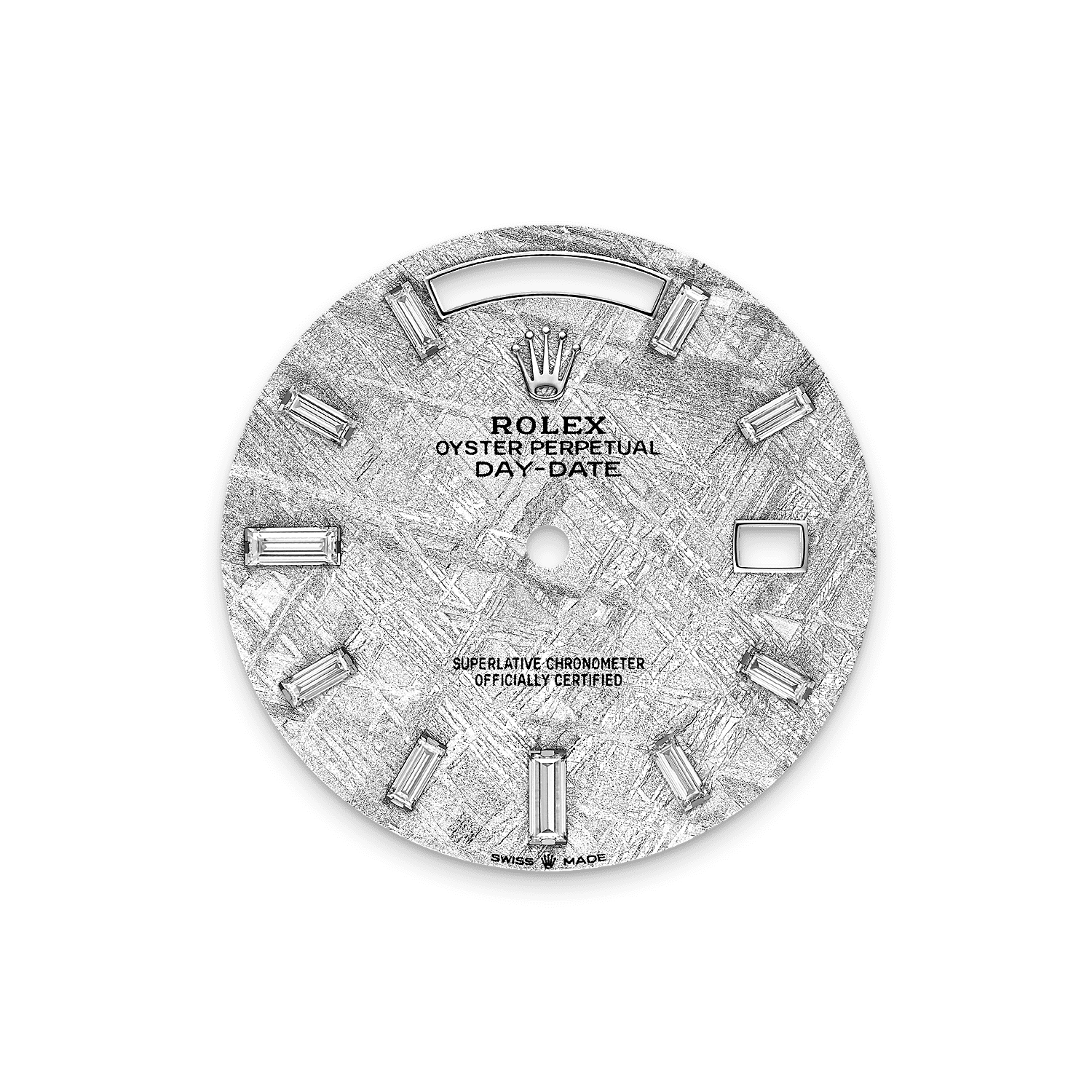 蚝式恒动星期日历型 40腕表铂金款,搭配镶钻陨石表盘、三角坑纹外圈及元首型(President)表带。