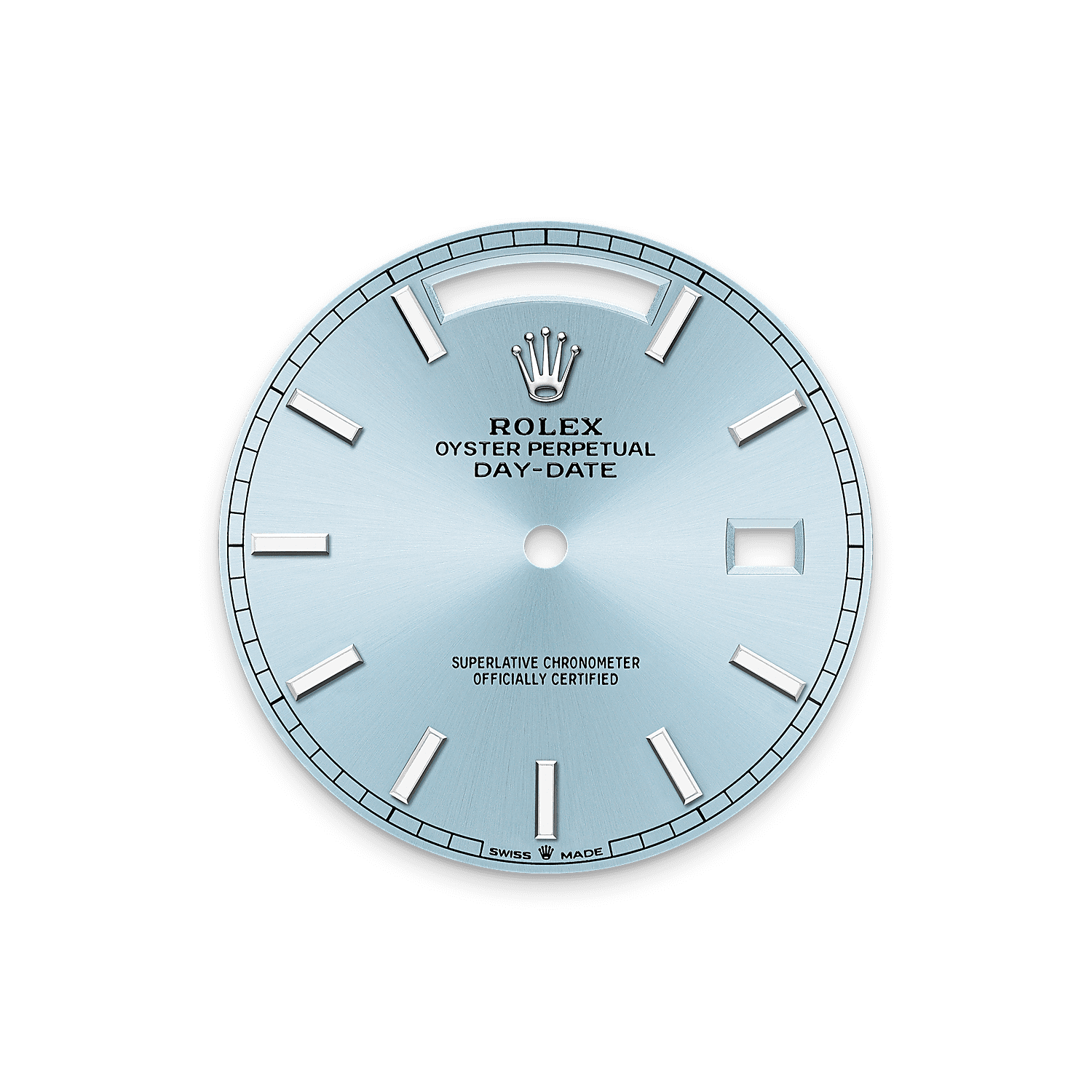 蚝式恒动星期日历型 40腕表铂金款,搭配冰蓝色表盘、三角坑纹外圈及元首型(President)表带。