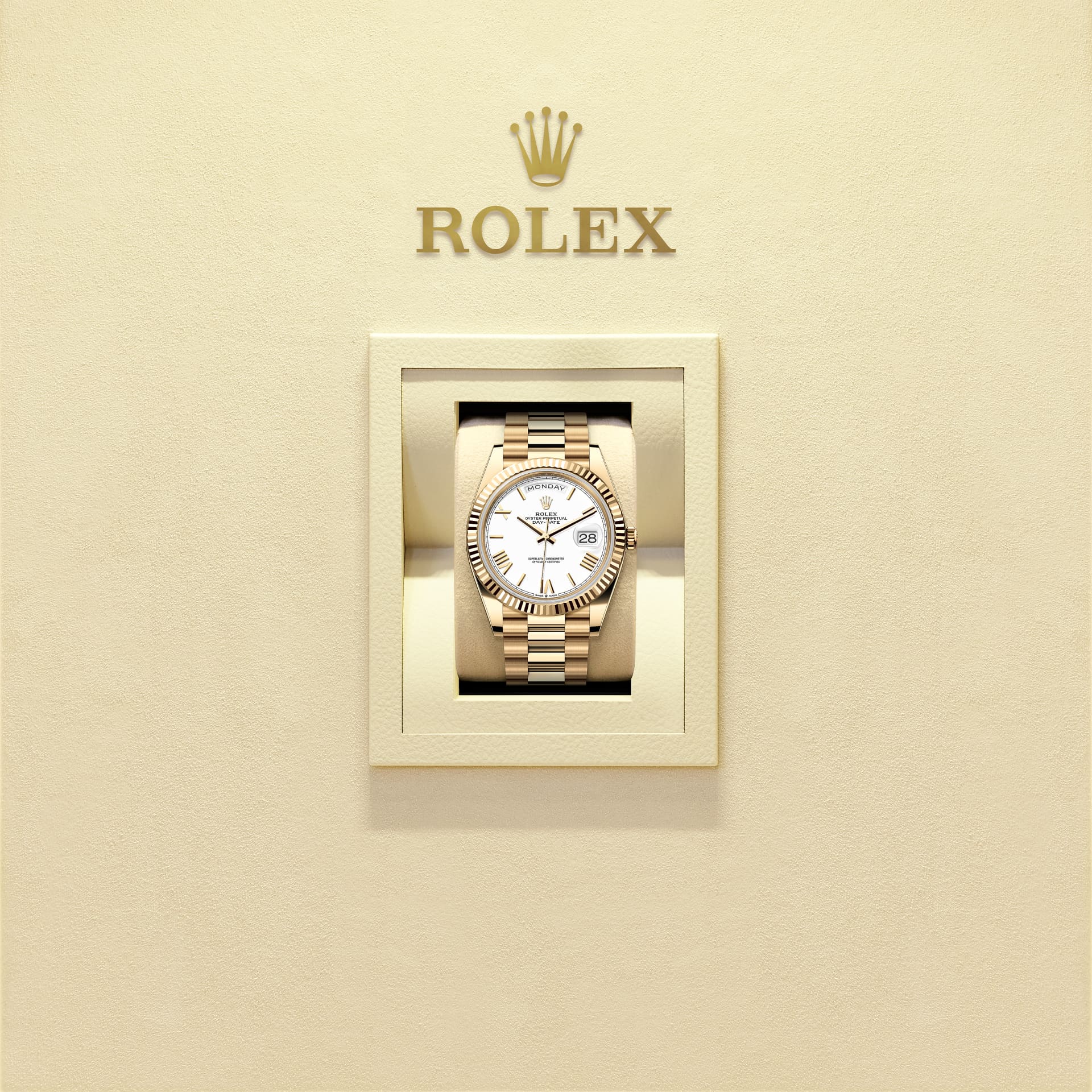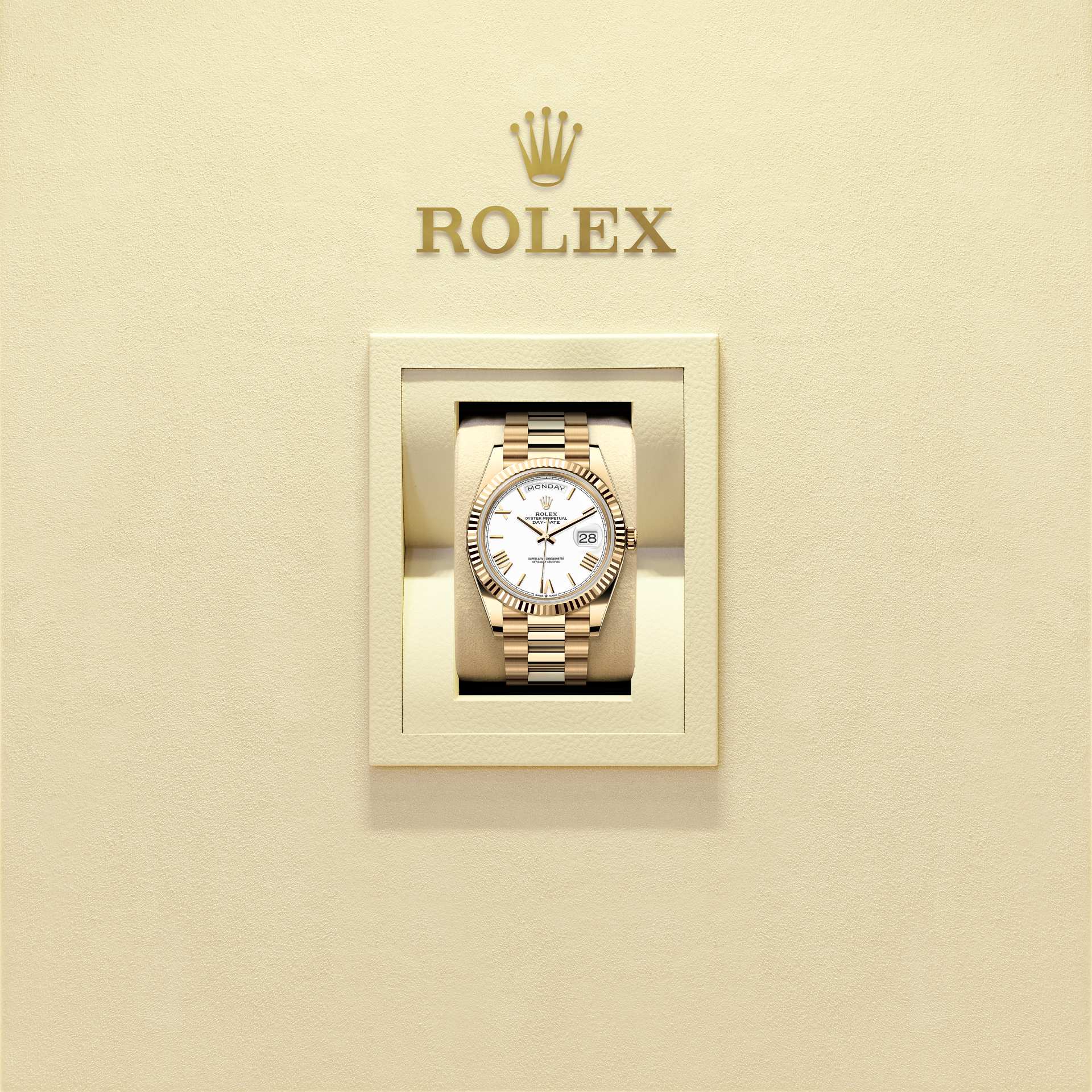 蚝式恒动星期日历型 40腕表18K黄金款,搭配白色表盘、三角坑纹外圈及元首型(President)表带。