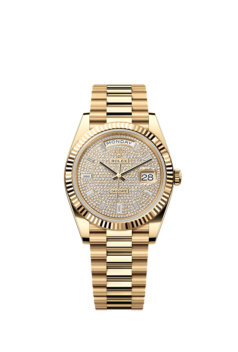 蚝式恒动星期日历型 40腕表18K黄金款,搭配密镶钻石表盘、三角坑纹外圈及元首型(President)表带。