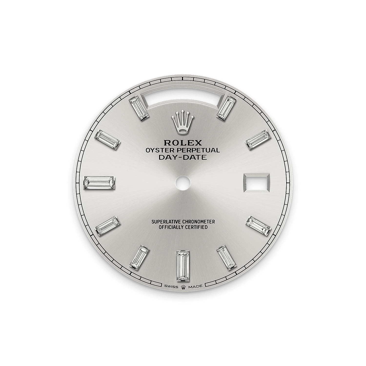 蚝式恒动星期日历型 40腕表18K白色黄金款,搭配镶钻银色表盘、三角坑纹外圈及元首型(President)表带。