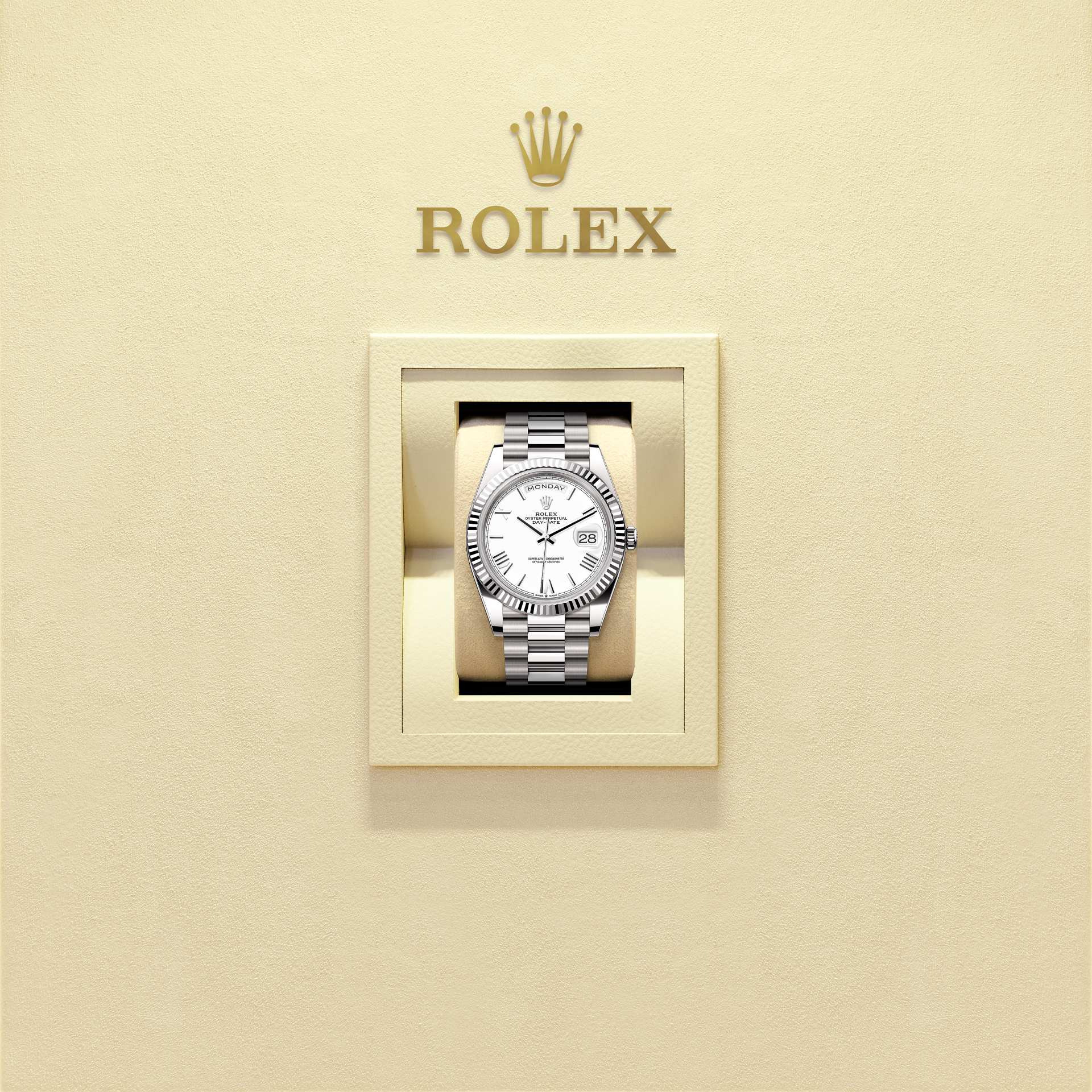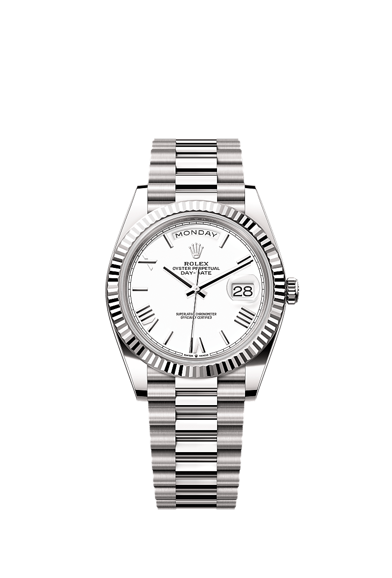 蚝式恒动星期日历型 40腕表18K白色黄金款,搭配白色表盘、三角坑纹外圈及元首型(President)表带。