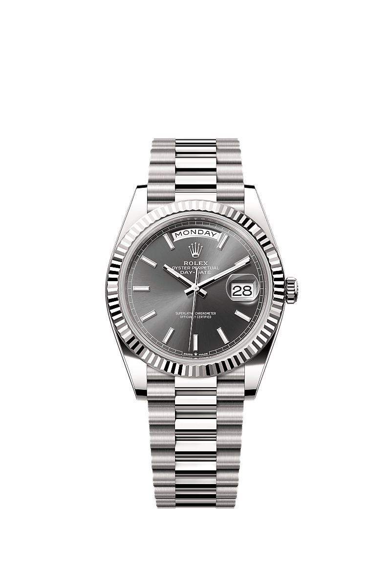 蚝式恒动星期日历型 40腕表18K白色黄金款,搭配石板灰色表盘、三角坑纹外圈及元首型(President)表带。
