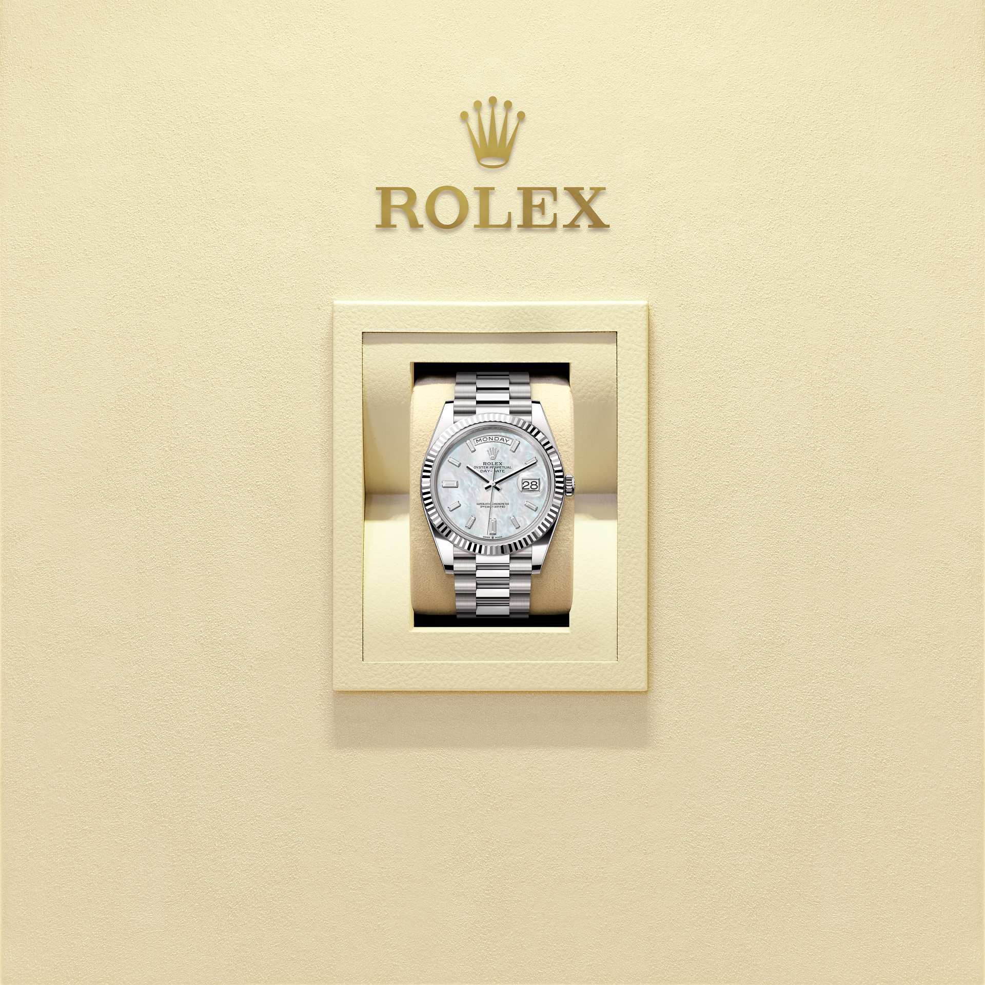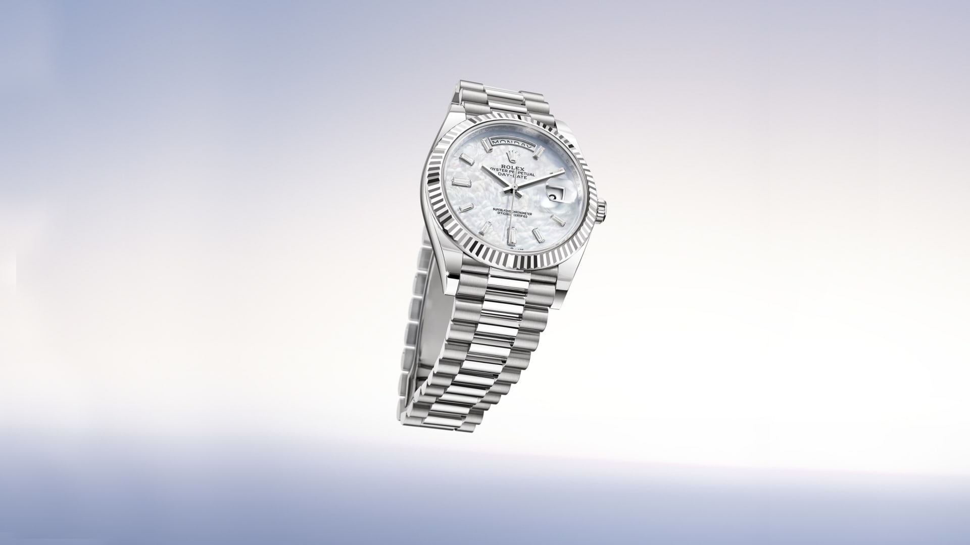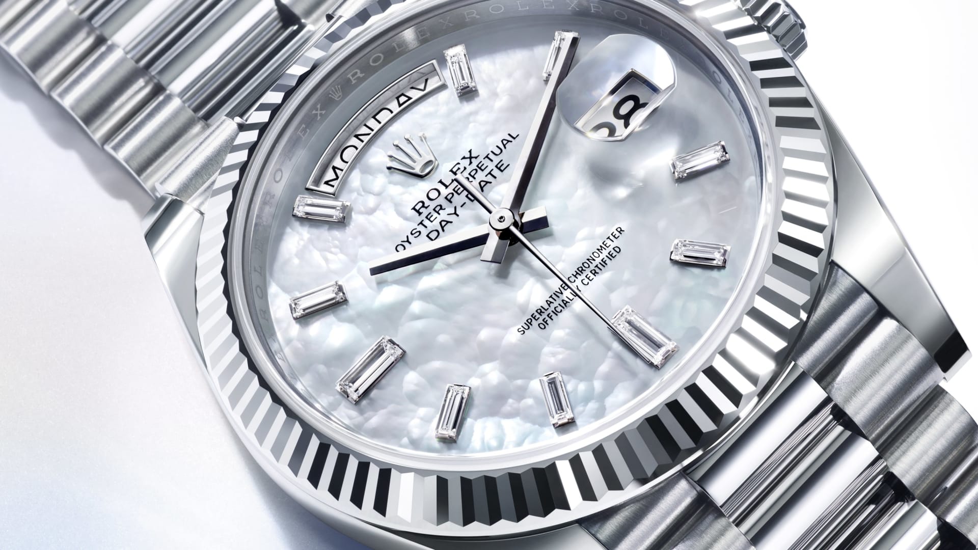 蚝式恒动星期日历型 40腕表18K白色黄金款,搭配镶钻白色珍珠母表盘、三角坑纹外圈及元首型(President)表带。
