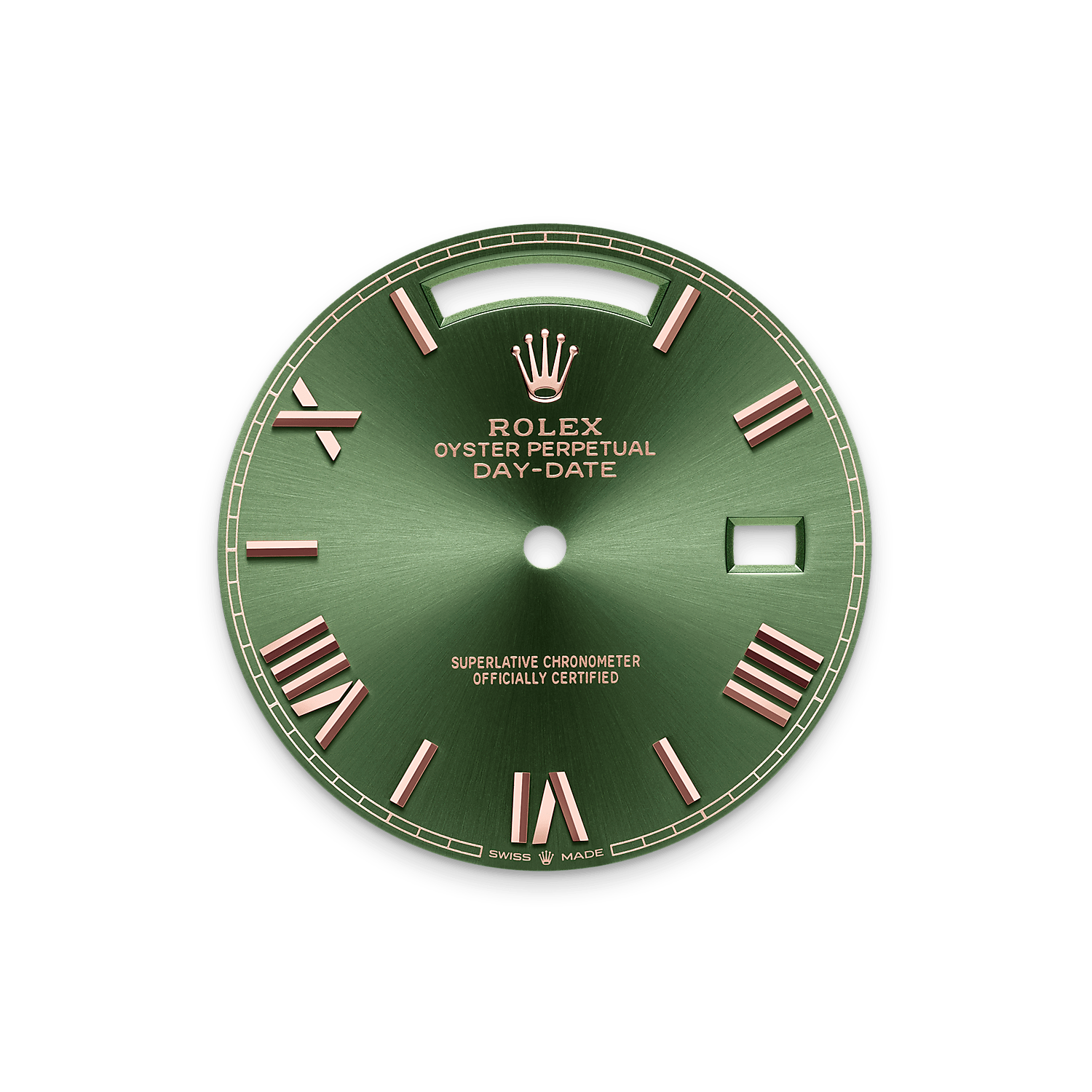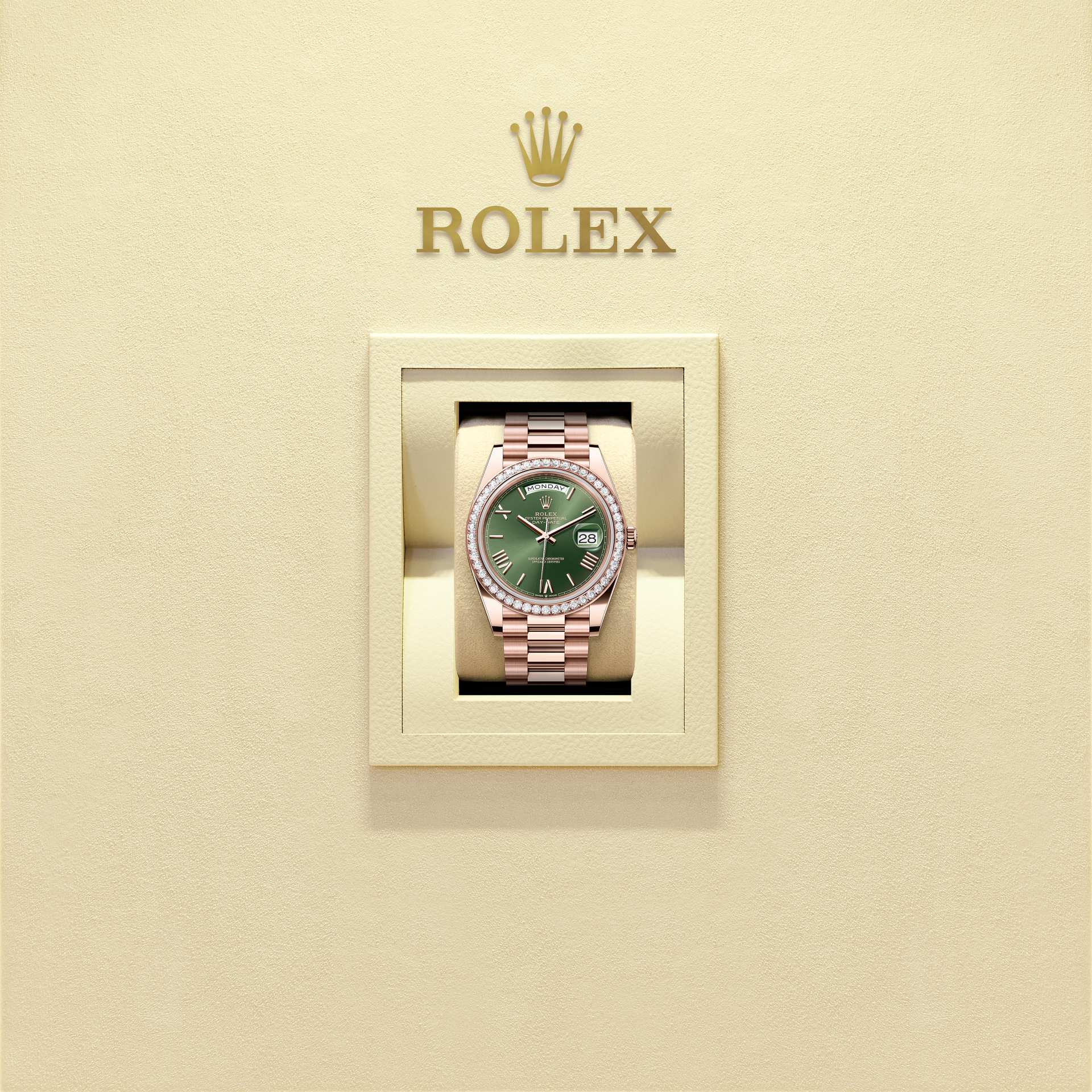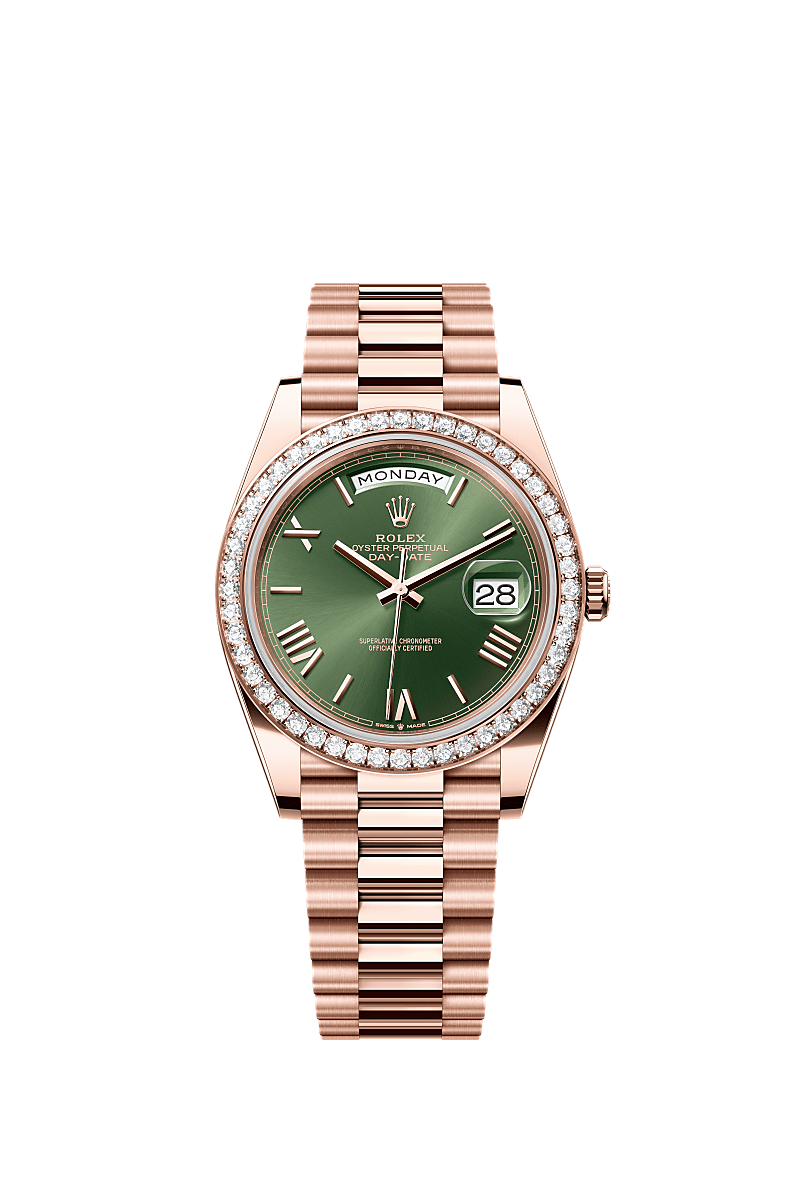 蚝式恒动星期日历型 40腕表18K永恒玫瑰金款,搭配橄榄绿色表盘、镶钻外圈及元首型(President)表带。